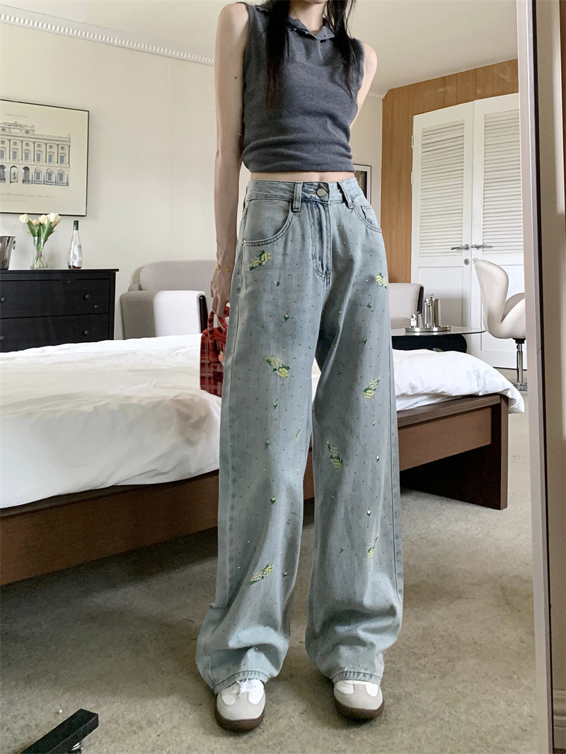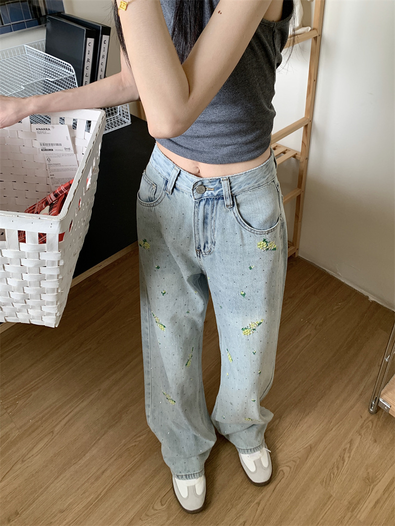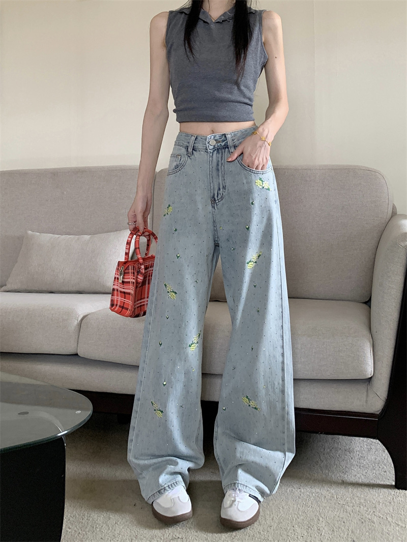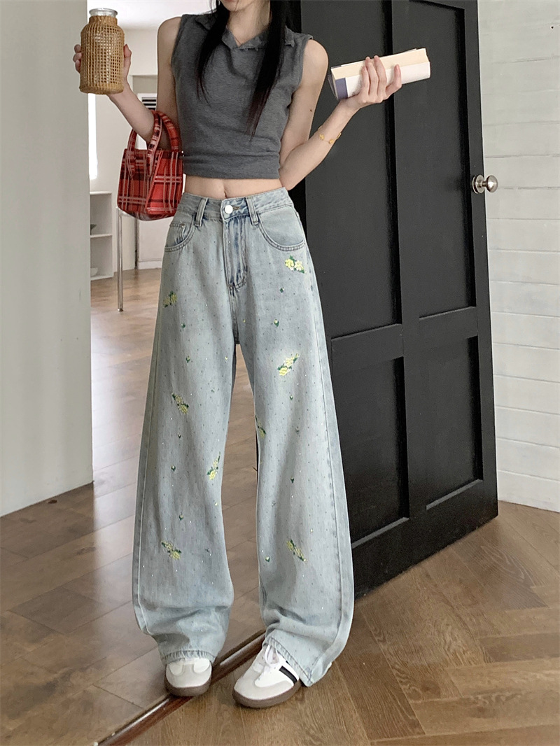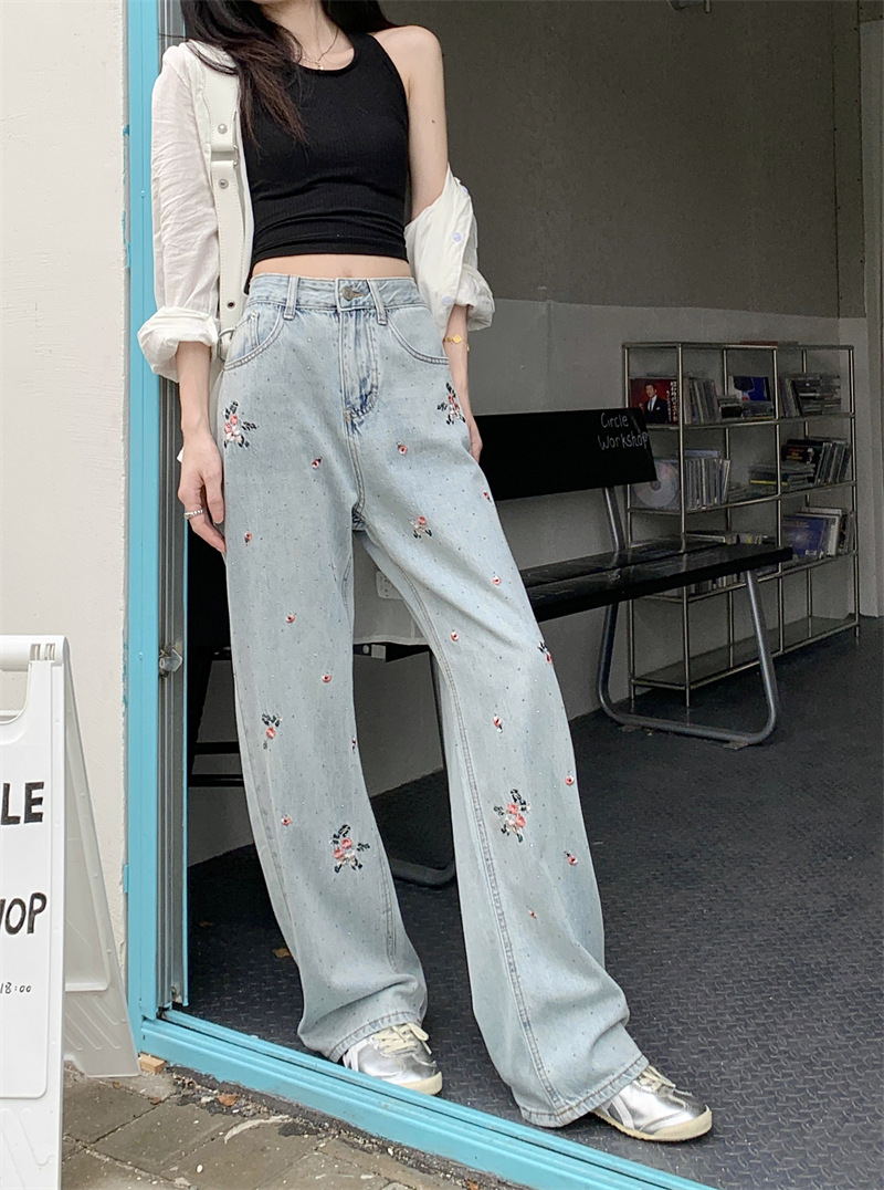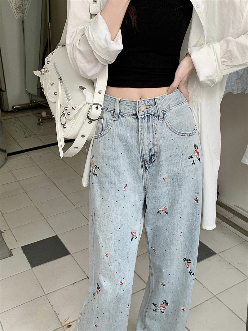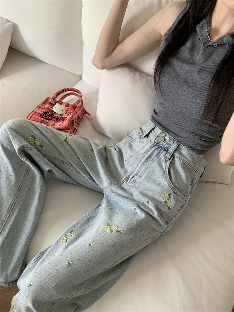 清新小黄花刺绣新款宽松高腰水钻直筒牛仔裤拖地裤