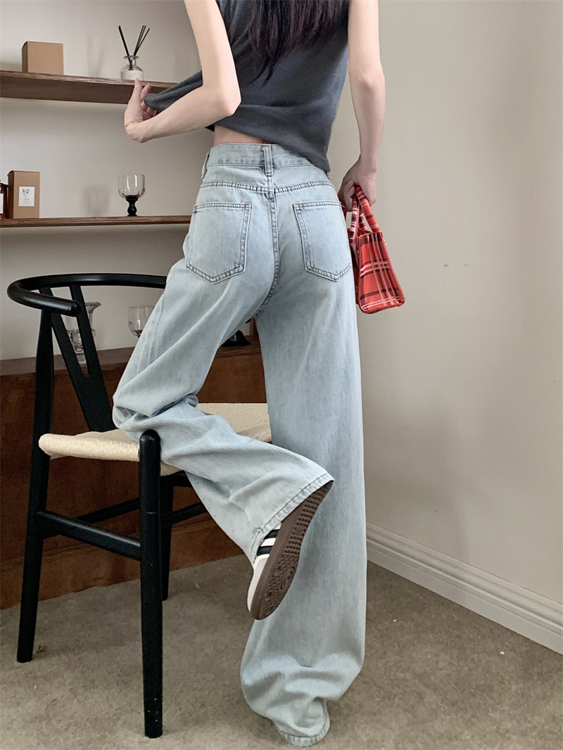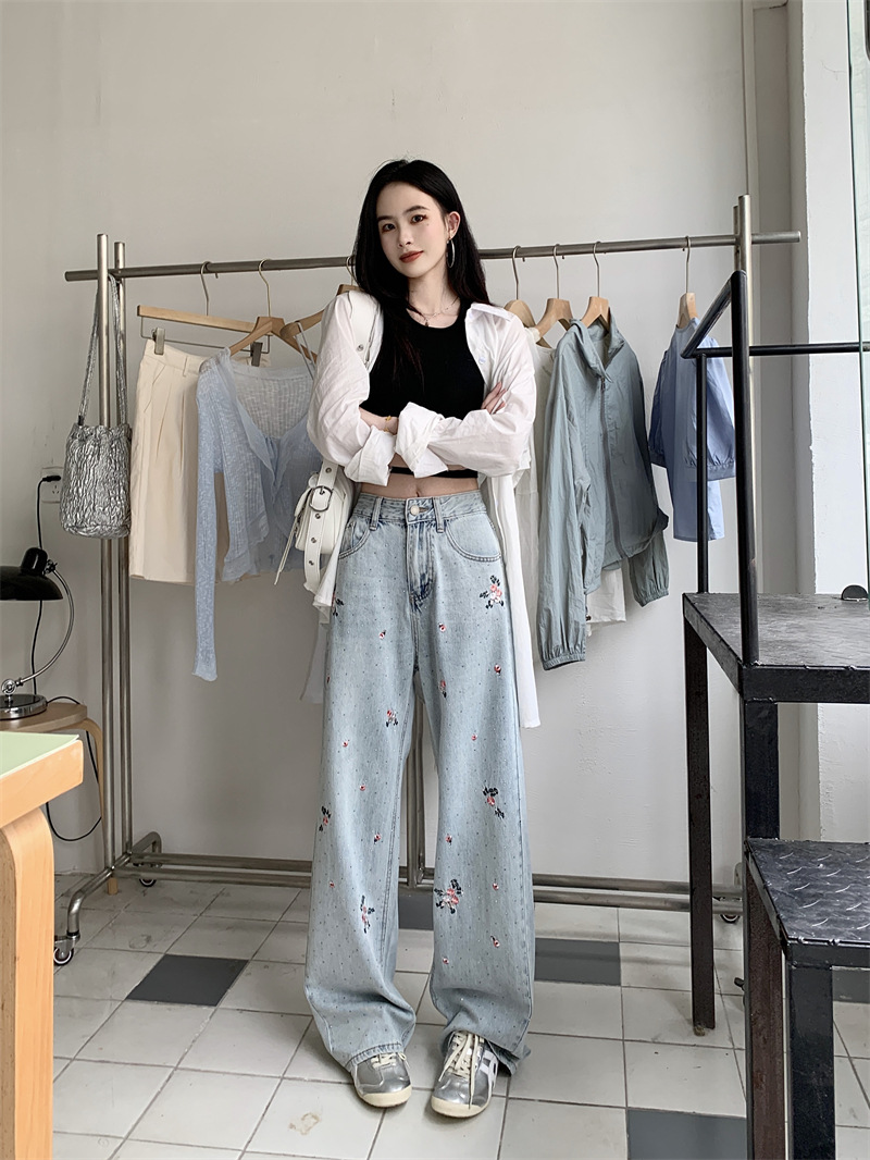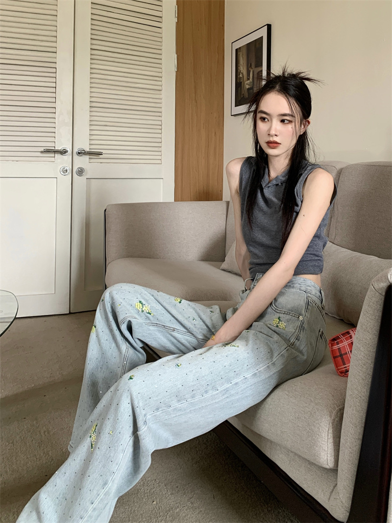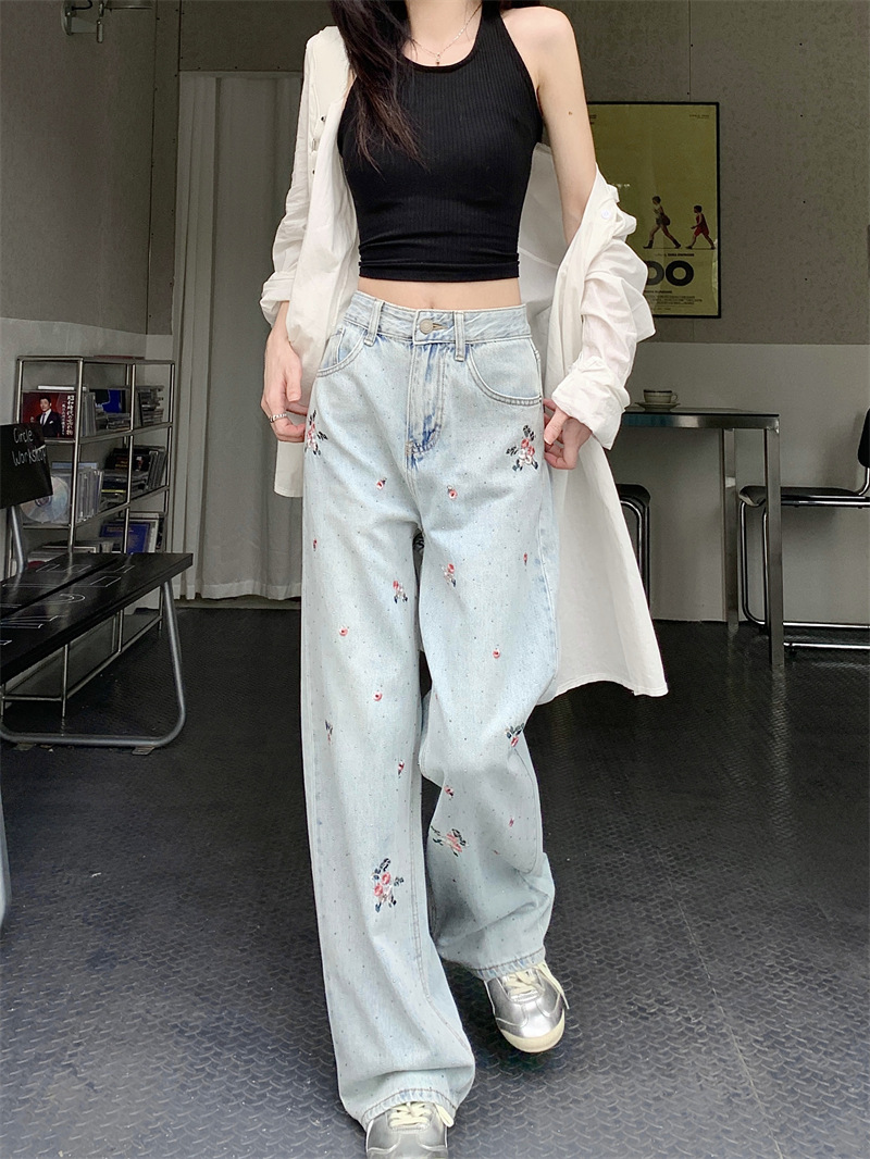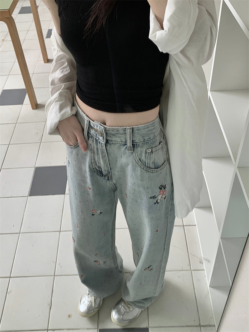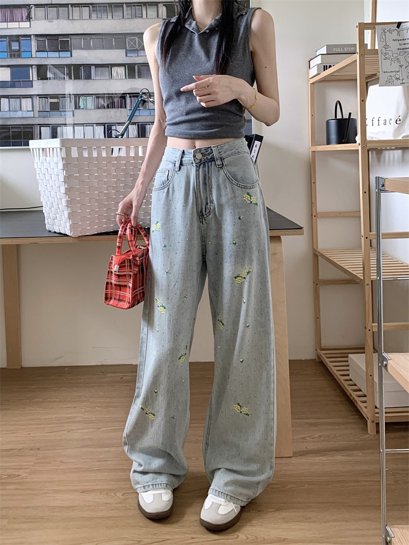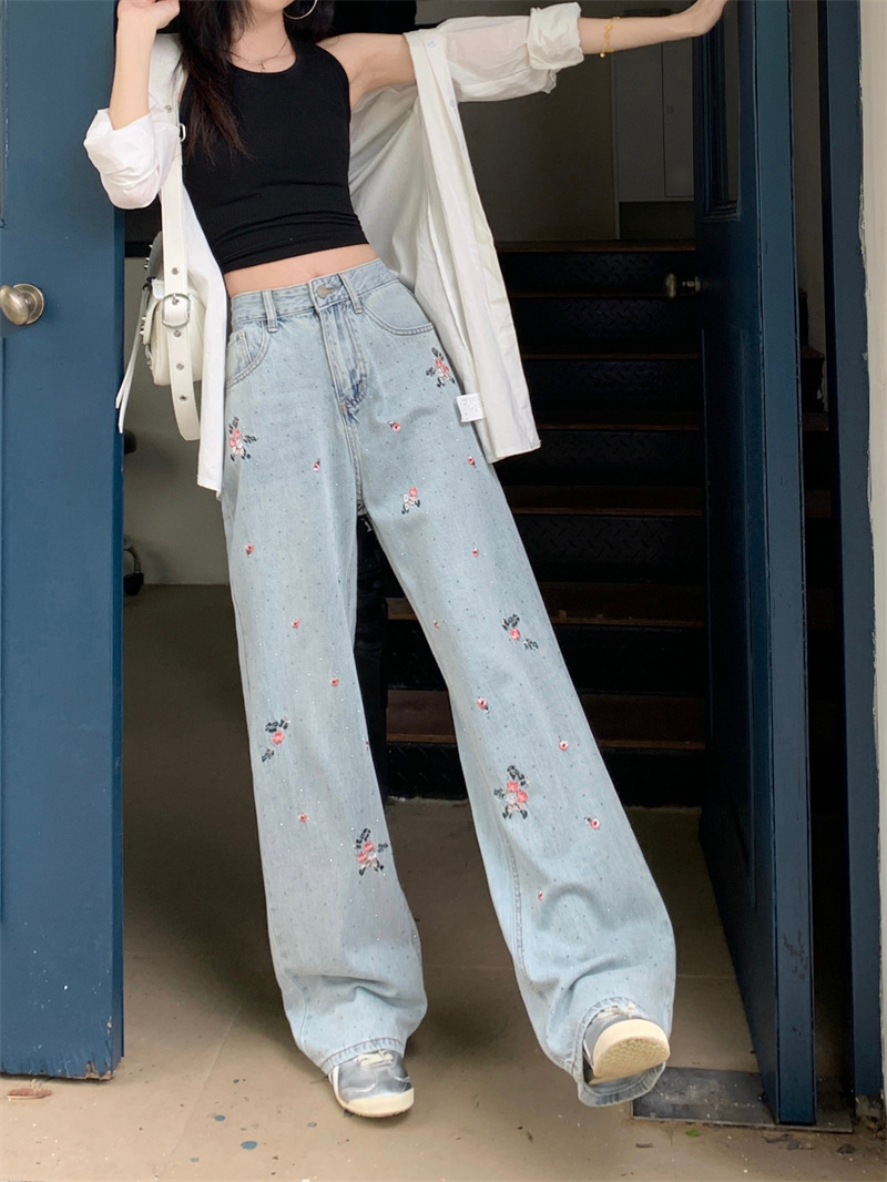 清新小黄花刺绣新款宽松高腰水钻直筒牛仔裤拖地裤