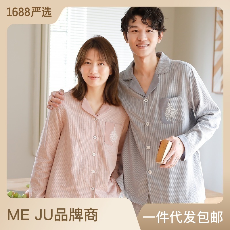 蔓秋 秋季新品情侣睡衣套装女士长袖睡衣棉纱男士纯棉睡衣家居服