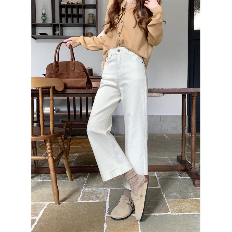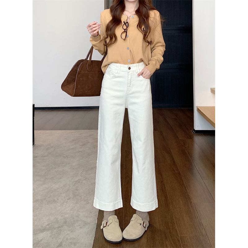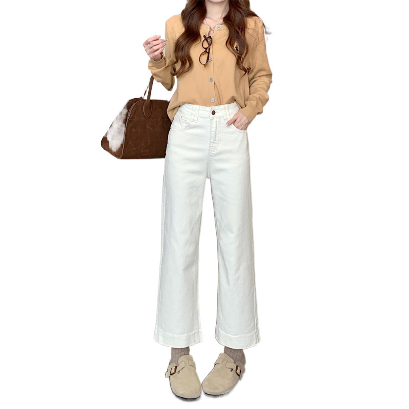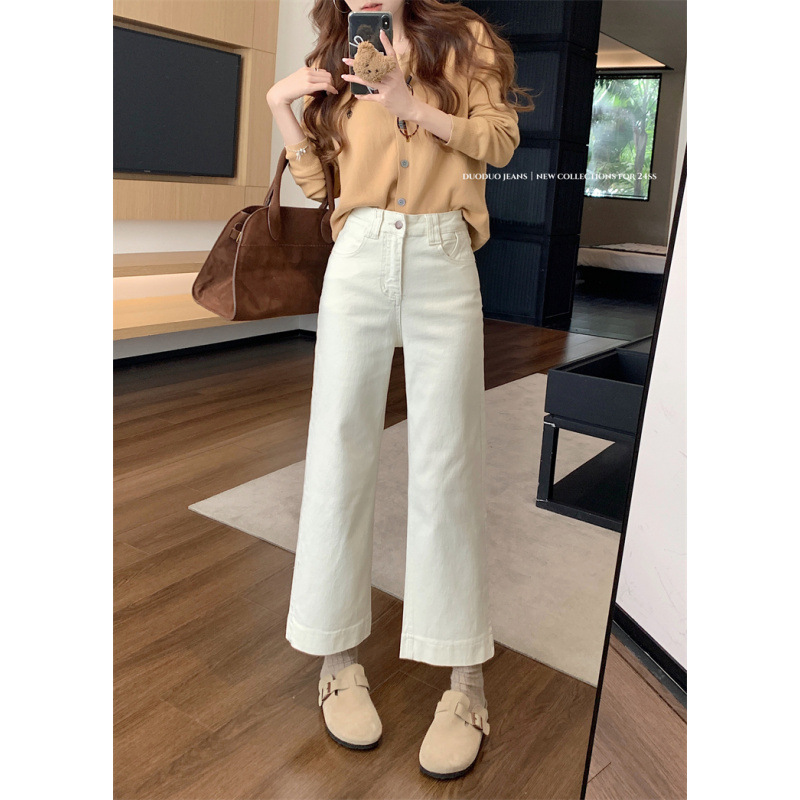 早春新款弹力直筒牛仔裤女高腰宽松显瘦小个子九分阔腿裤女