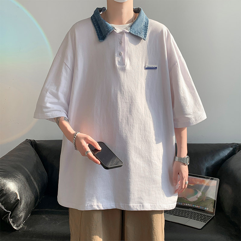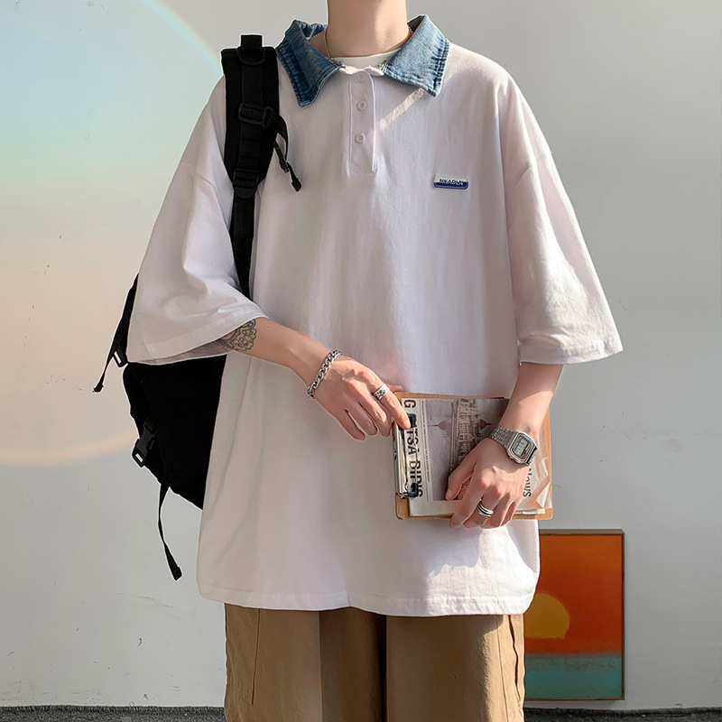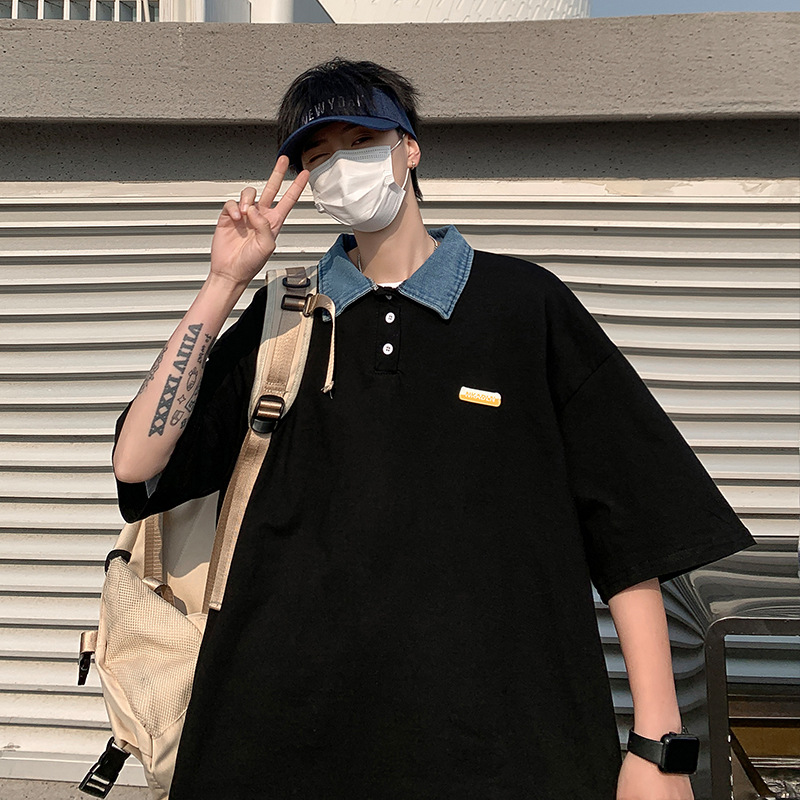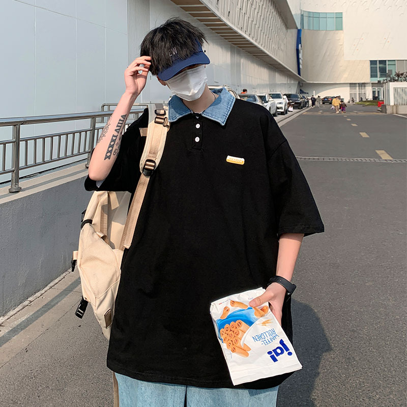 日系Polo衫夏季男士翻领短袖复古休闲百搭潮流港风宽松ins潮牌t恤
