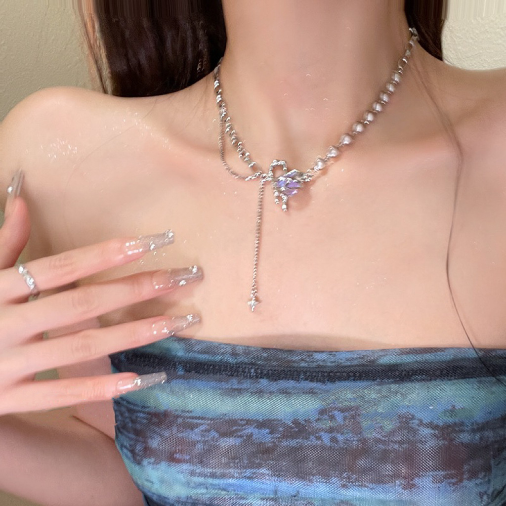 幻彩海蓝宝爱心珍珠拼接项链女多巴胺饰品百搭轻奢小众流苏锁骨链