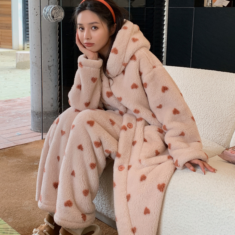 冬季加绒加厚保暖睡衣套装睡袍长裤浴袍连帽家居服女