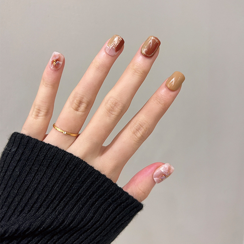 假指甲秋冬穿戴甲棕色晕染金箔美甲贴片甲片果冻胶穿戴甲片