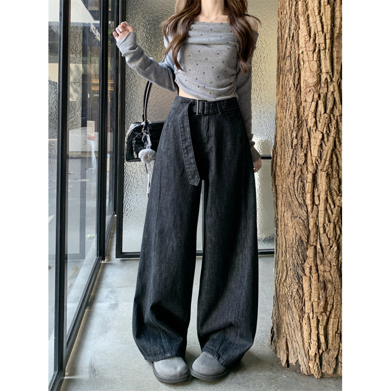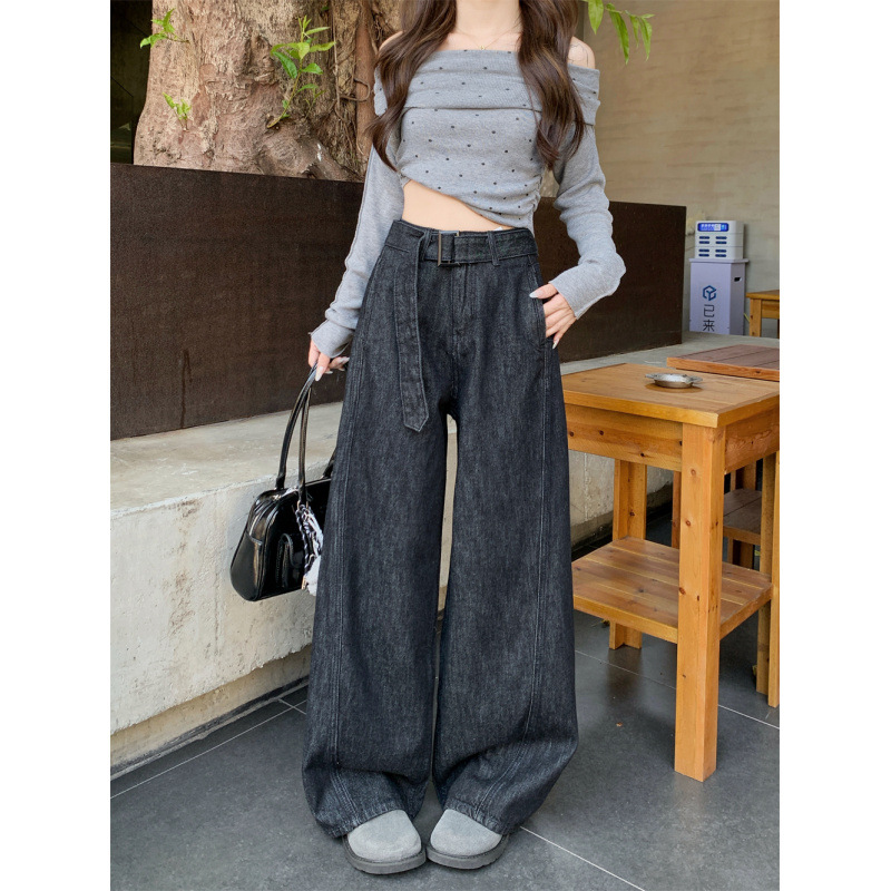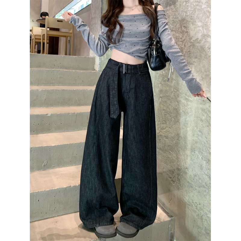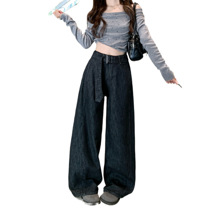 系带高腰阔腿牛仔裤女港风休闲宽松弯刀裤