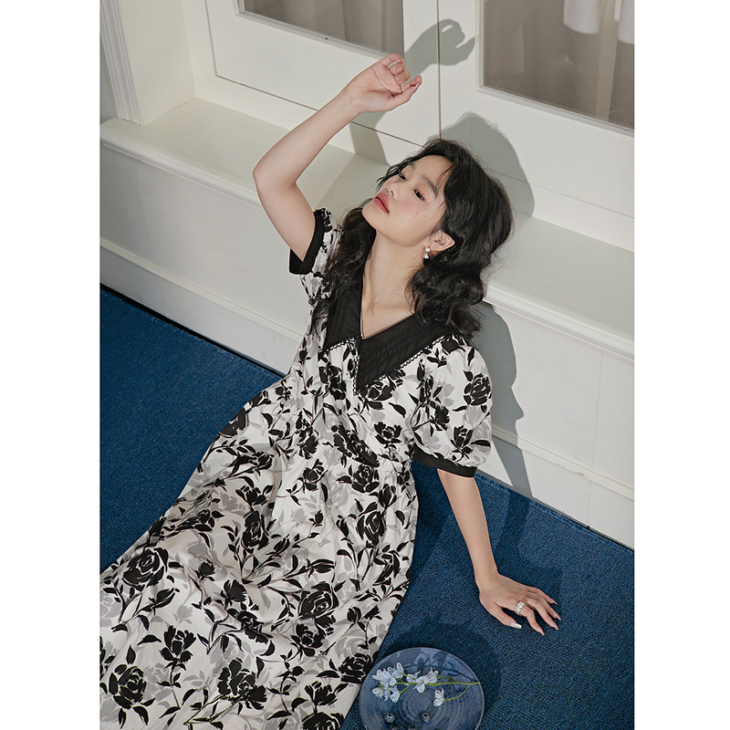 复古玫瑰碎花茶歇收腰连衣裙女夏季新款短袖长裙