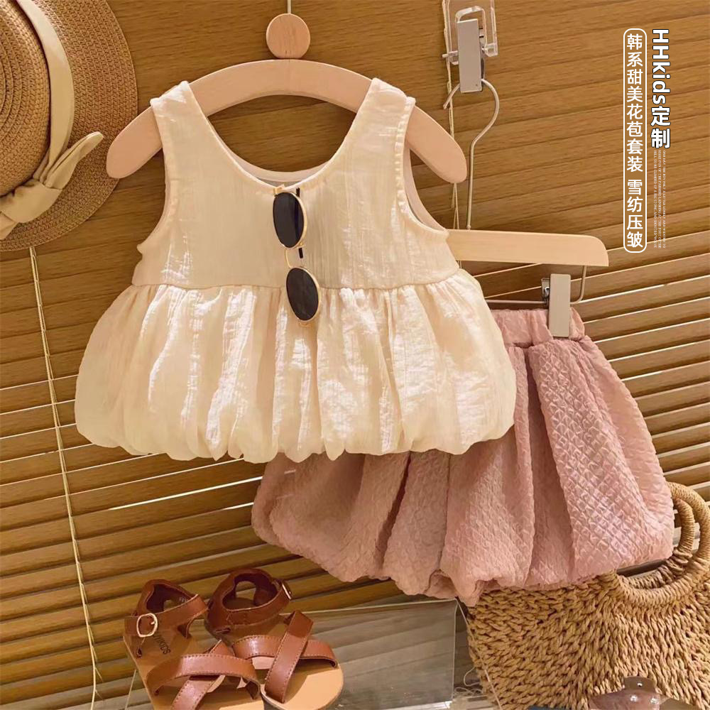 新品女童花苞吊带背心泡泡棉格短裤洋气两件套2025夏装