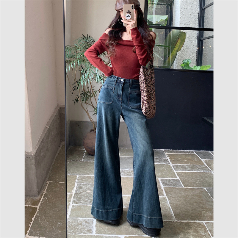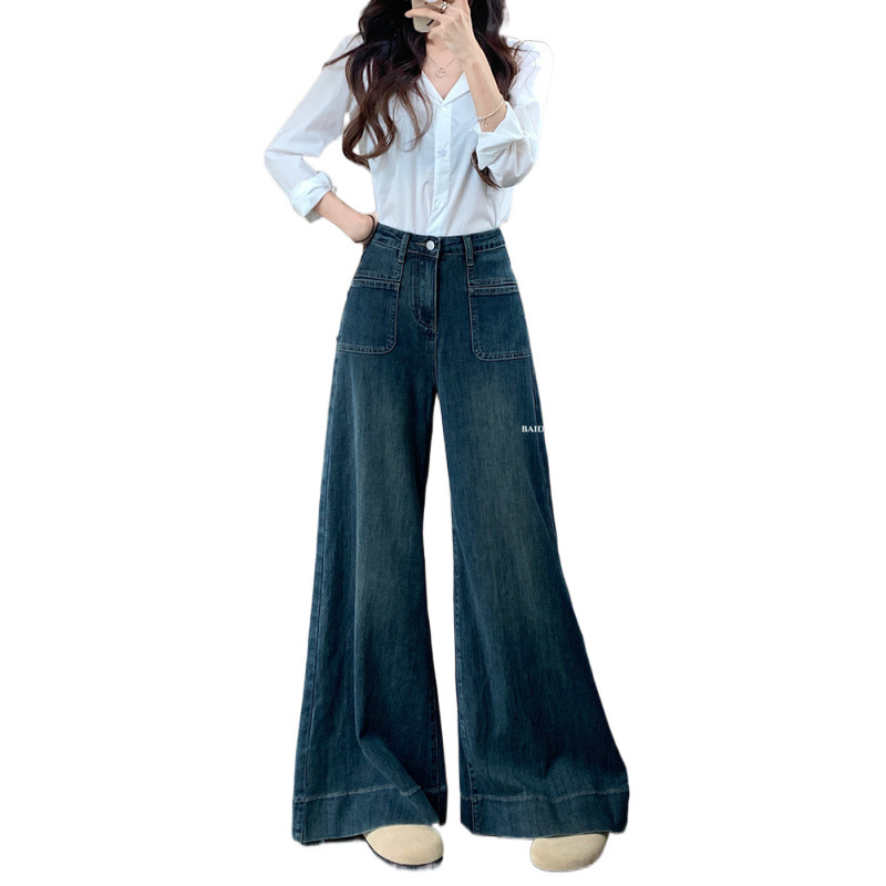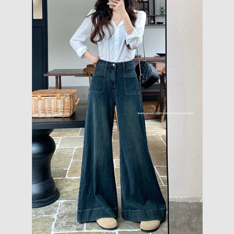 法式复古蓝色微喇牛仔裤女早秋高腰宽松阔腿拖地裤女