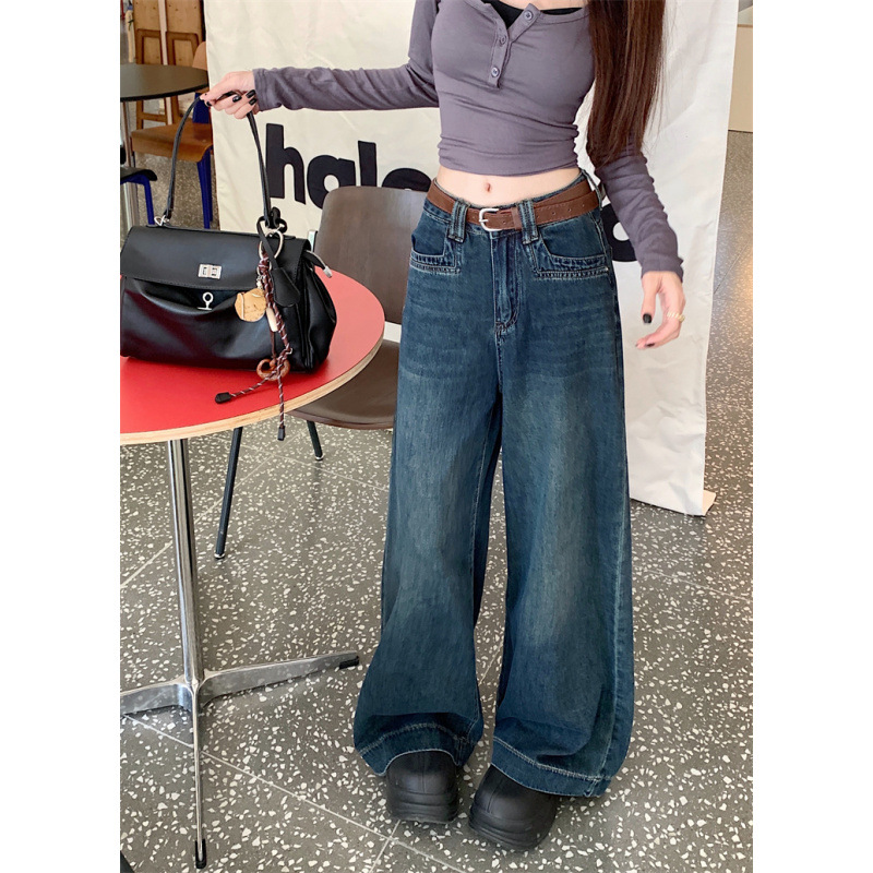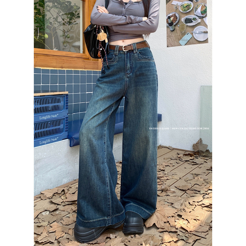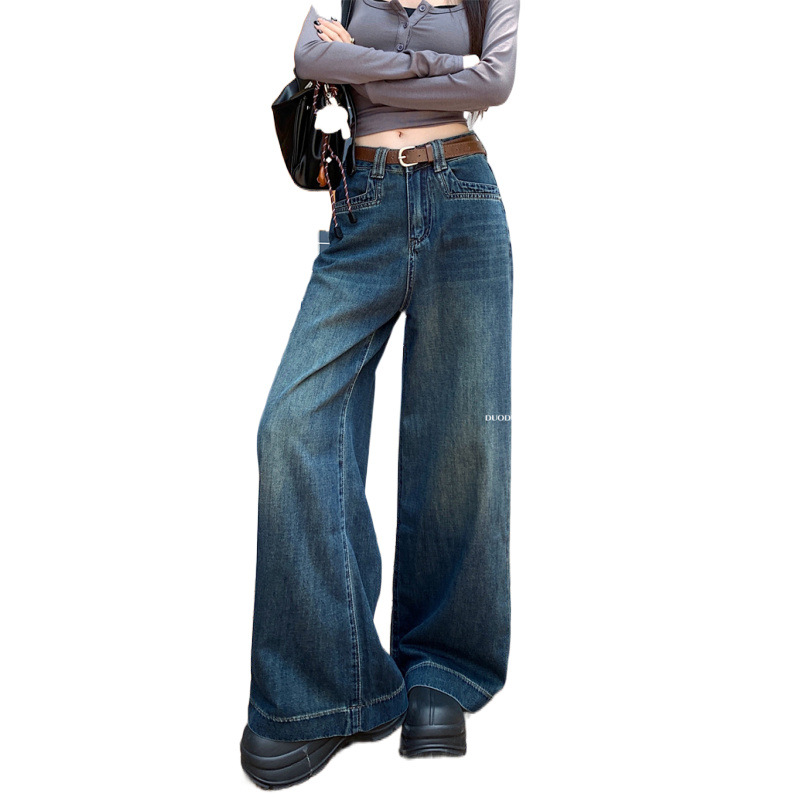 美式复古水洗阔腿牛仔裤女新款高腰宽松直筒拖地长裤女