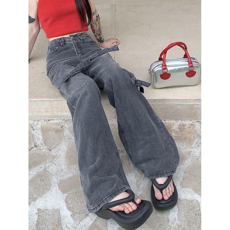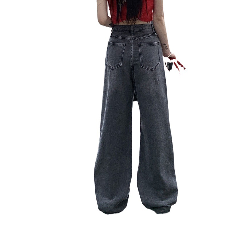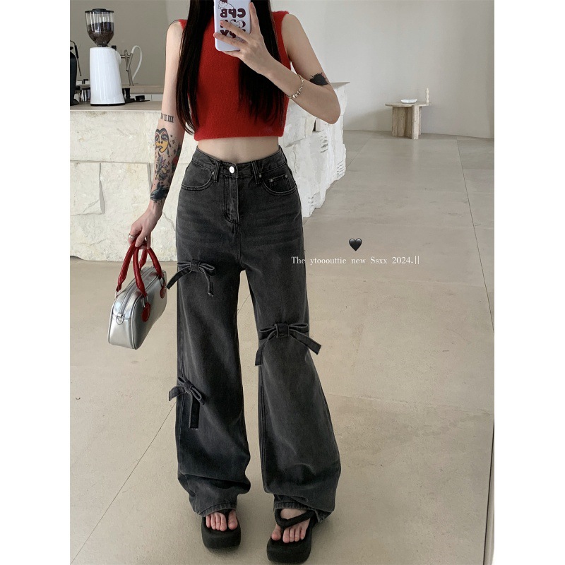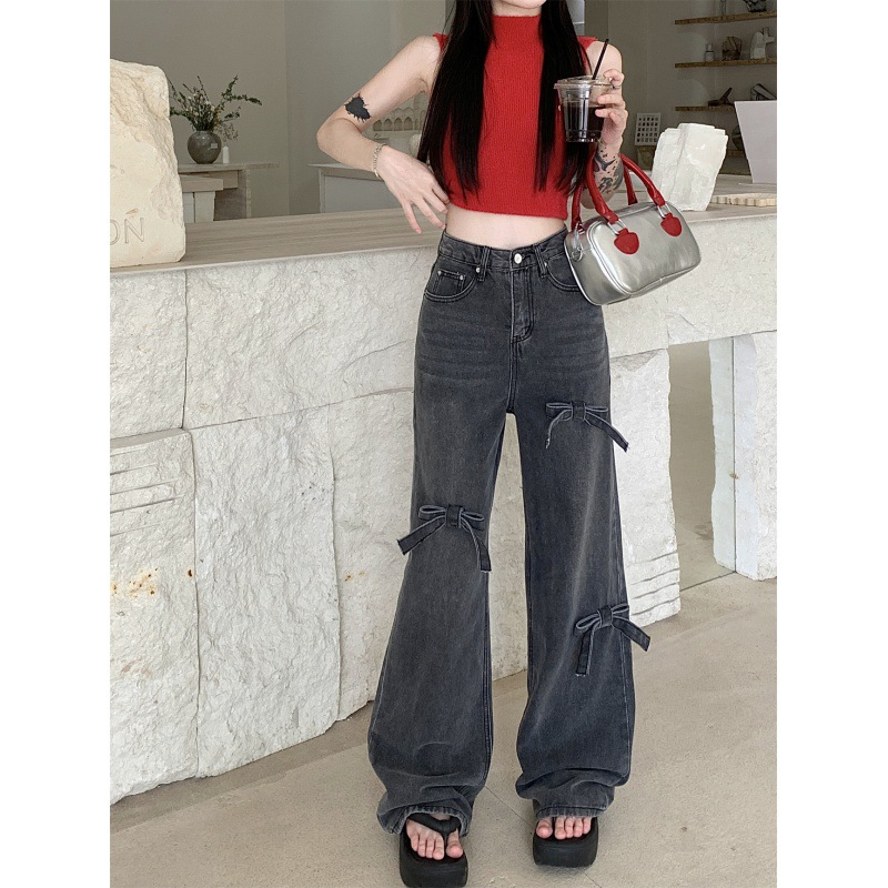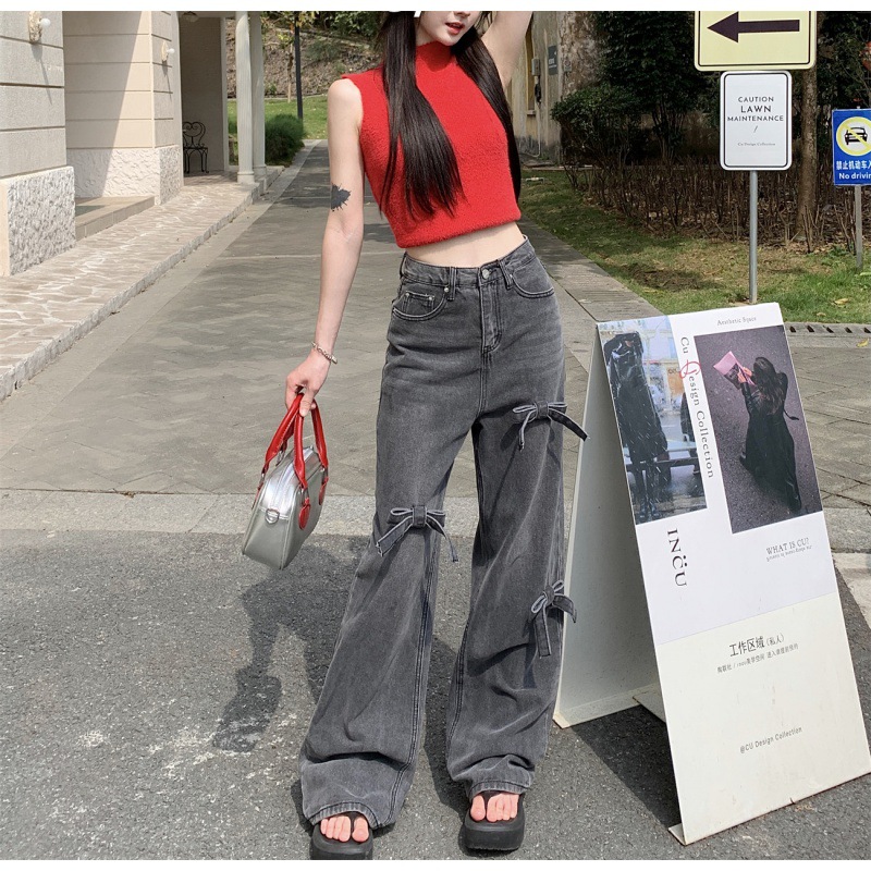 蝴蝶结 高腰宽松 直筒阔腿拖地裤 牛仔长裤女