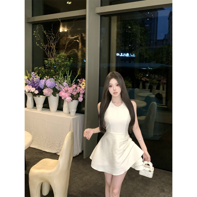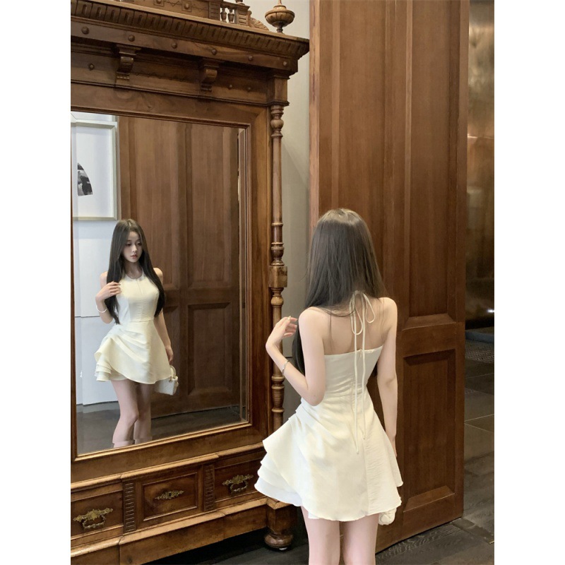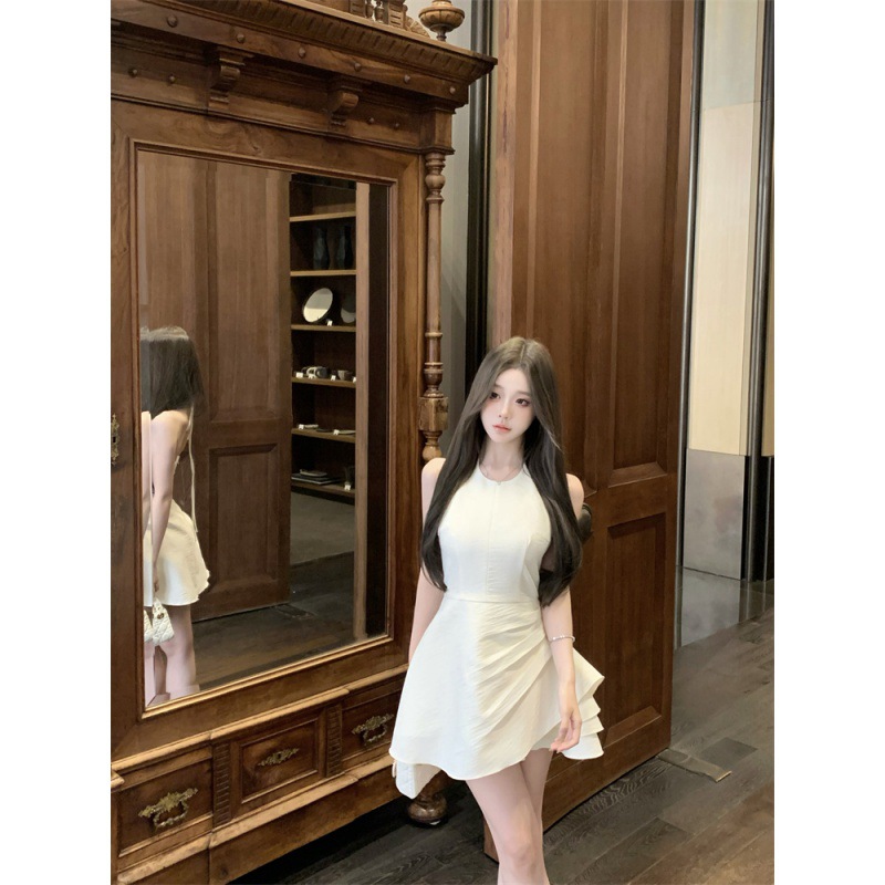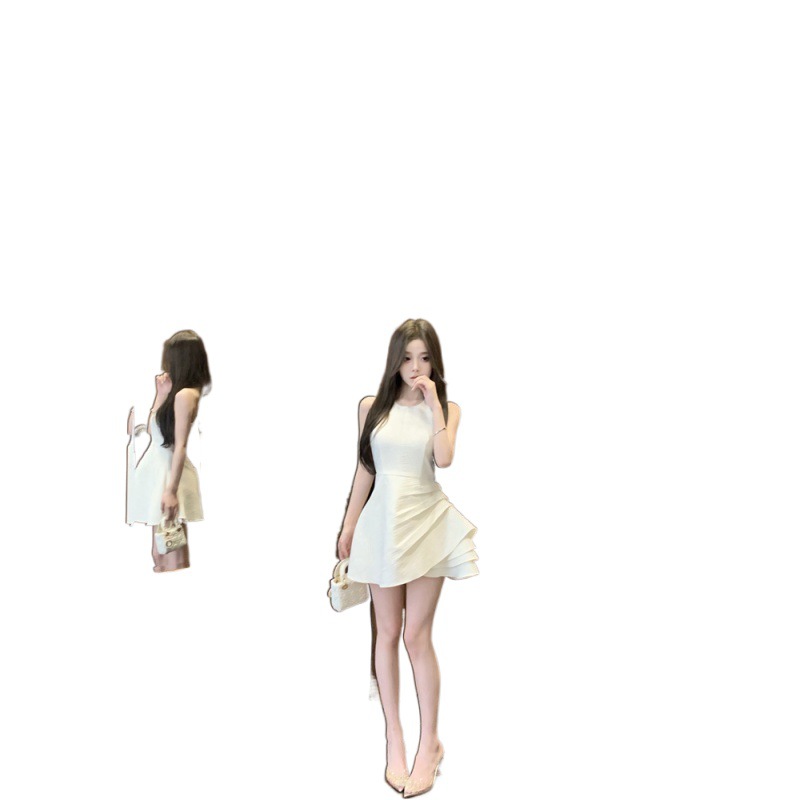 法式精致挂脖A字不规则多层裙摆连体裤连衣裙女