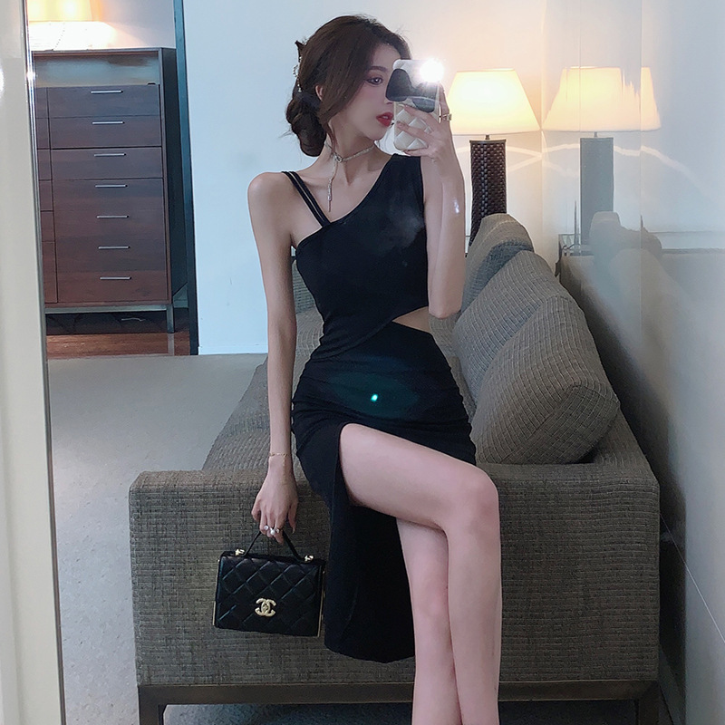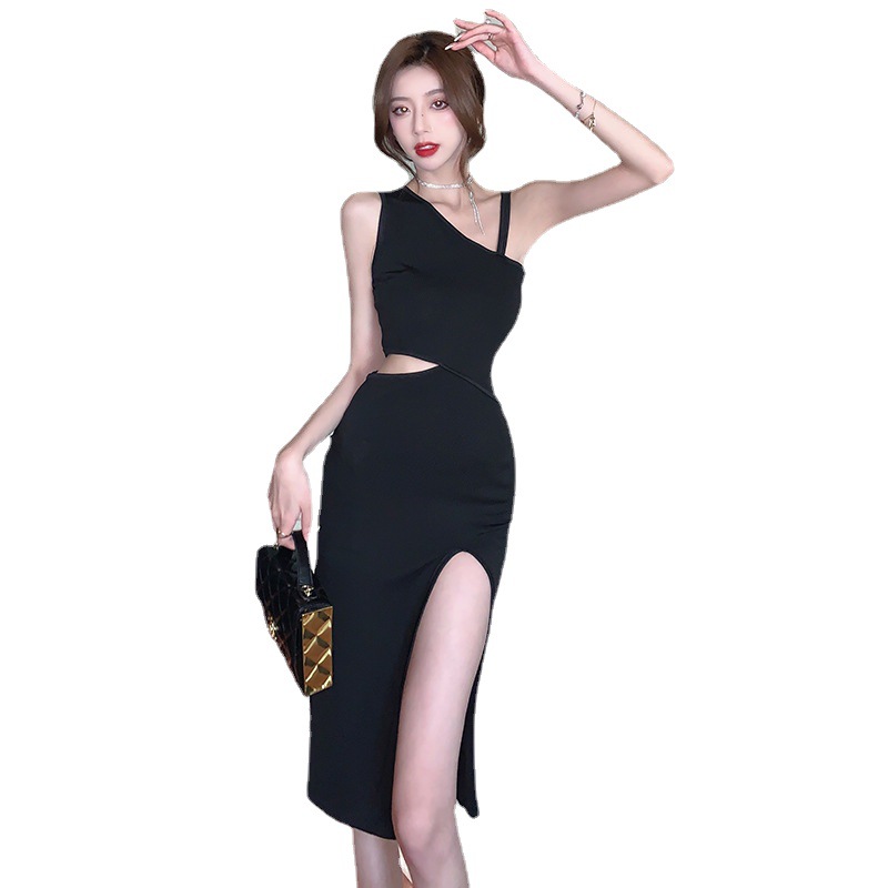 港味小黑裙夏ins性感小心机露腰吊带裙显瘦开叉礼服连衣裙