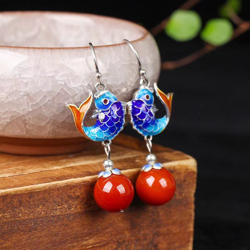 古典中国风鲤鱼景泰蓝南红玛瑙耳坠复古纯银耳环个性气质耳饰