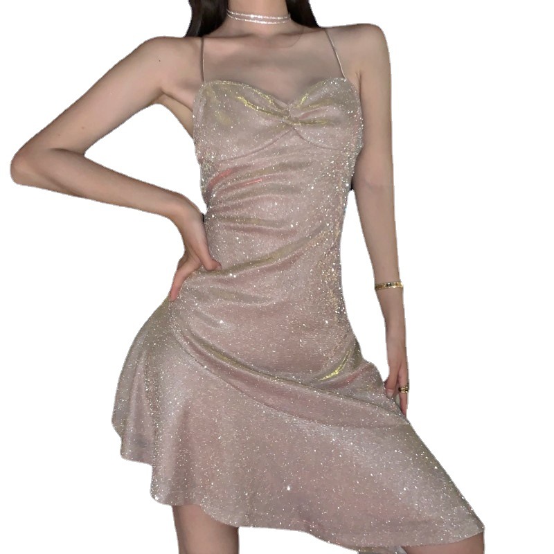新款夏季女装性感显瘦亮晶晶法式拼接V领挂脖吊带连衣裙子女