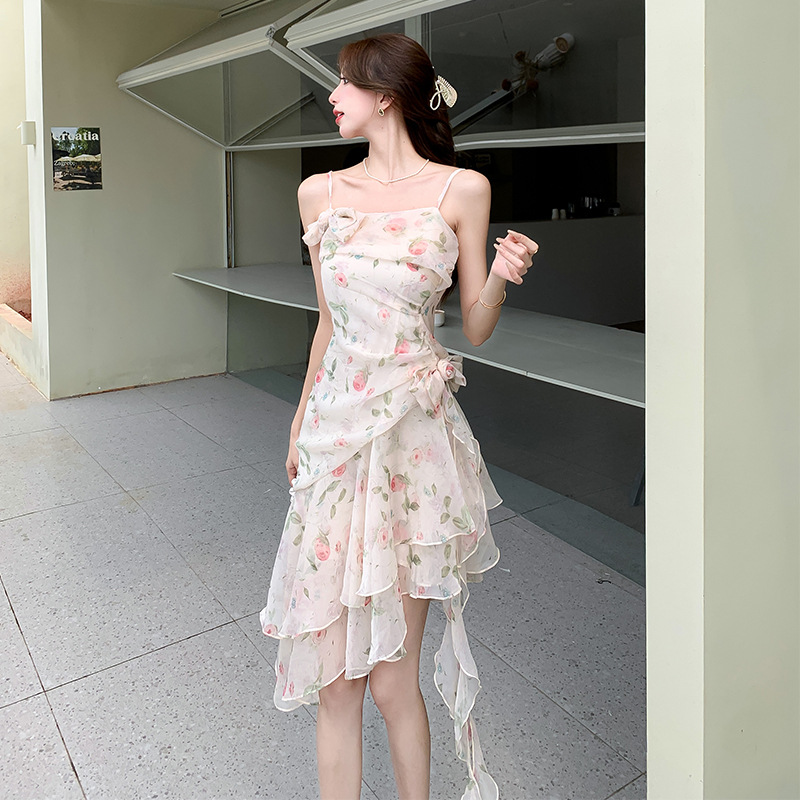 不规则桔梗法式浪漫印花吊带连衣裙女夏季显瘦气质裙子设计感