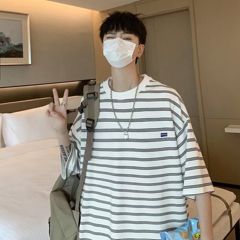 夏季潮日系条纹牌棉质短袖T恤男复古街头宽松情侣百搭体恤上衣服