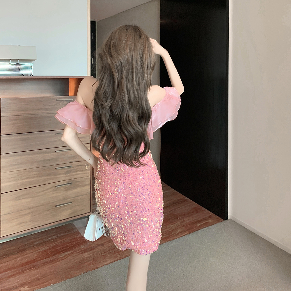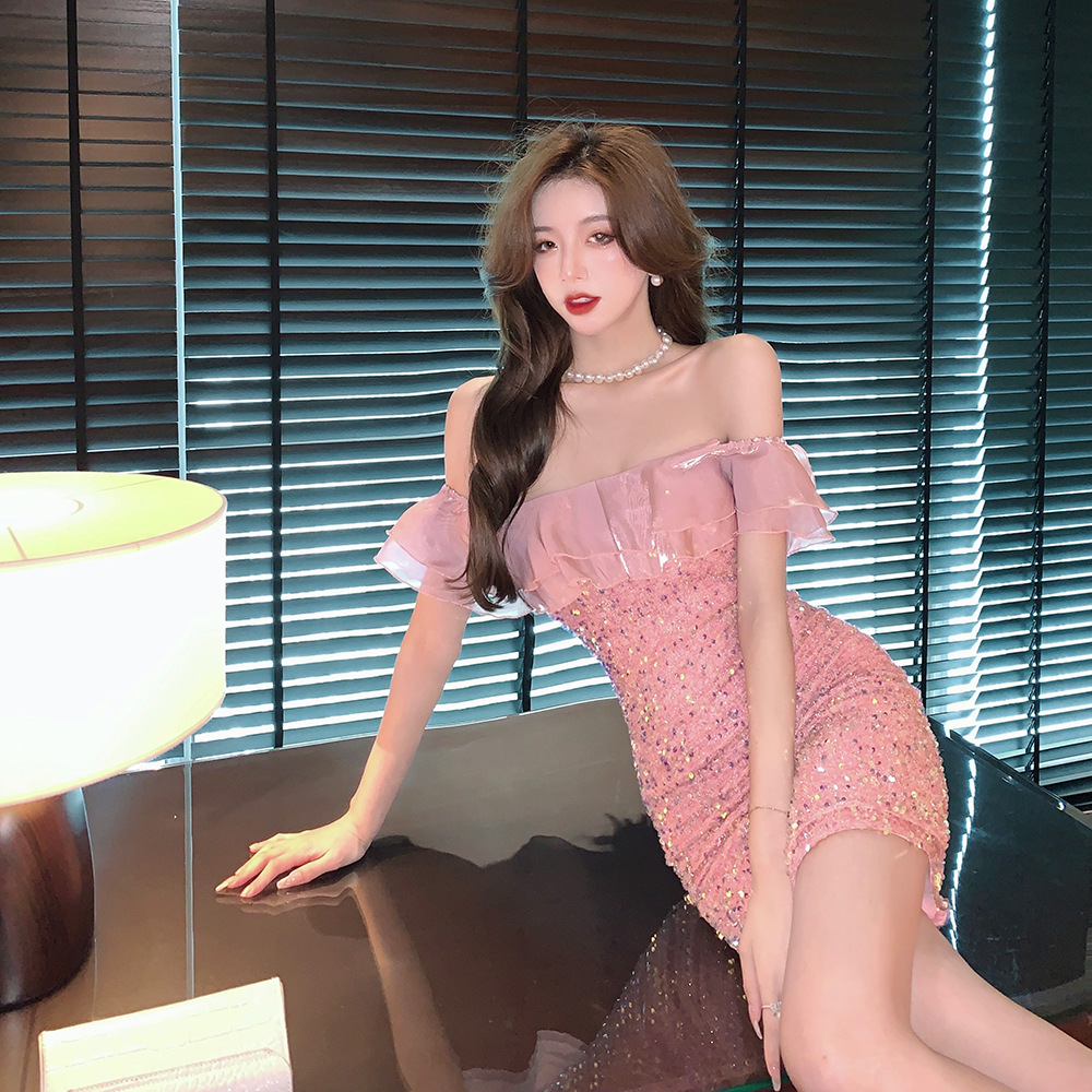 法式辣妹包臀裙女新款名媛重工艺珠片雪纺拼接修身露肩礼服连衣裙