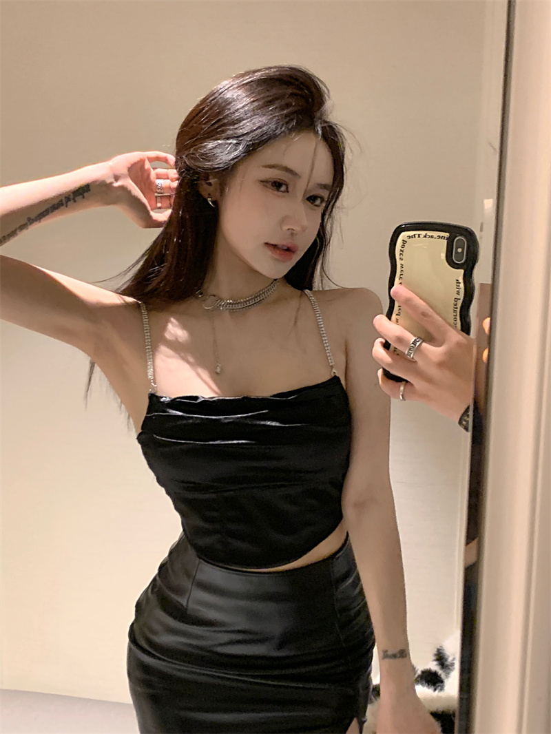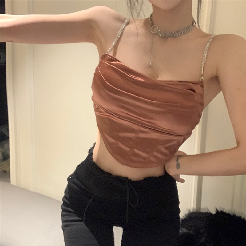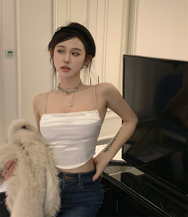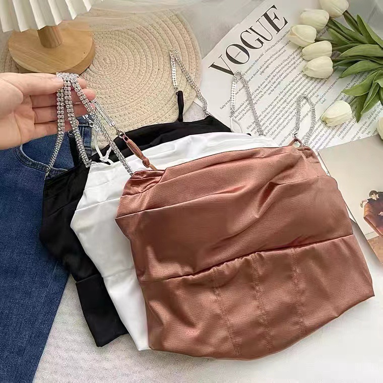 缎面吊带背心女夏季内搭外穿闪亮钻饰肩带带胸垫性感短款美背上衣