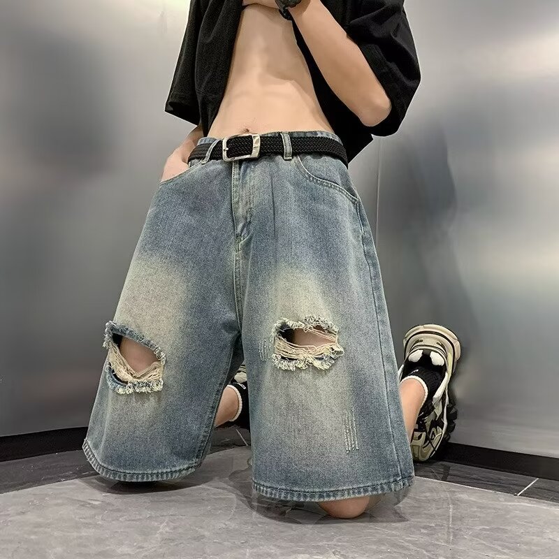 破洞牛仔短裤男夏季薄款美式高街潮牌外穿直筒裤痞帅休闲五分裤子