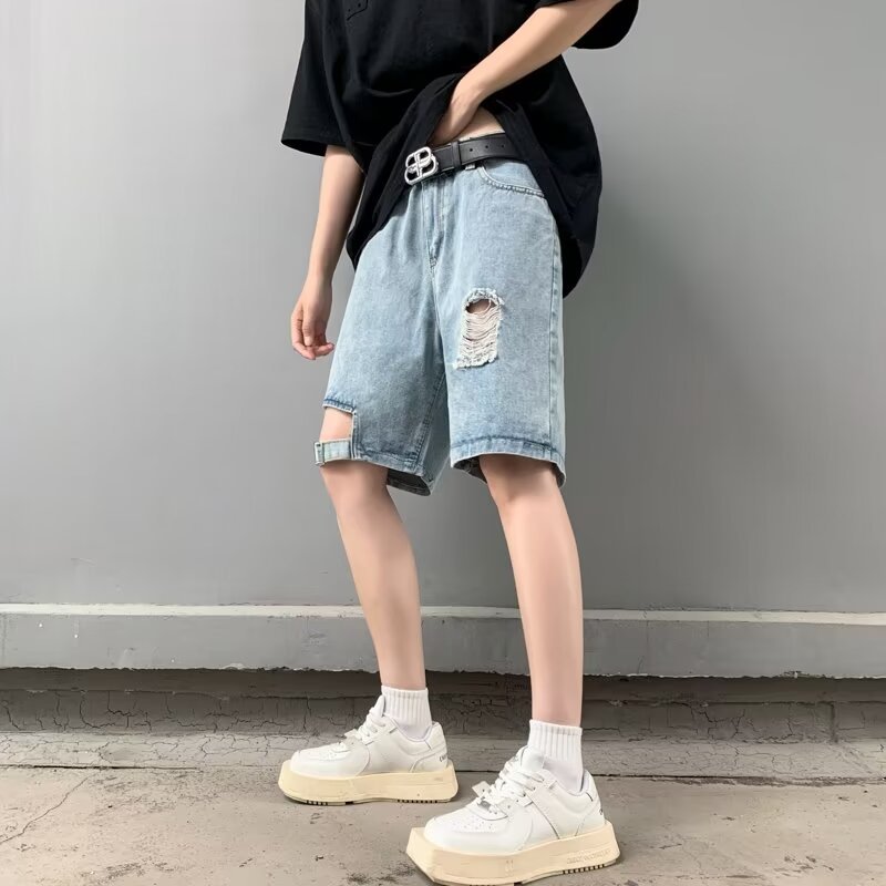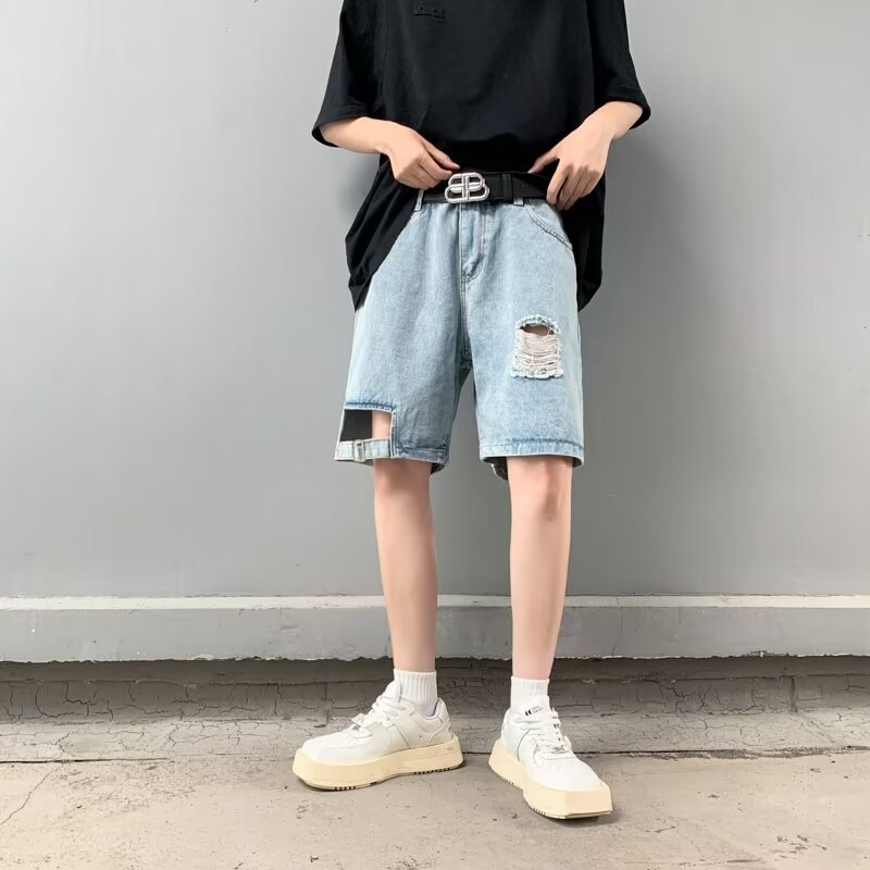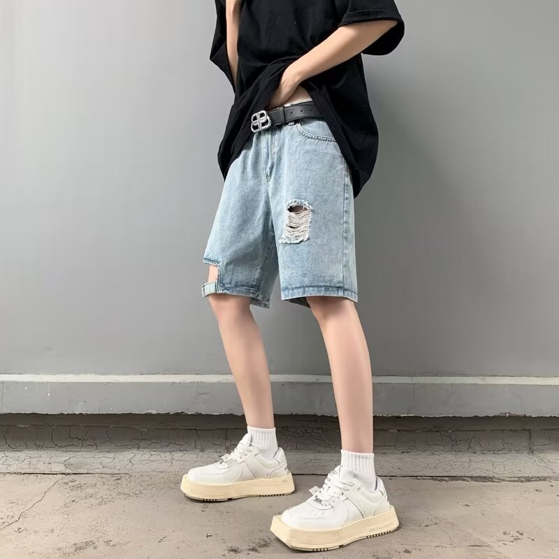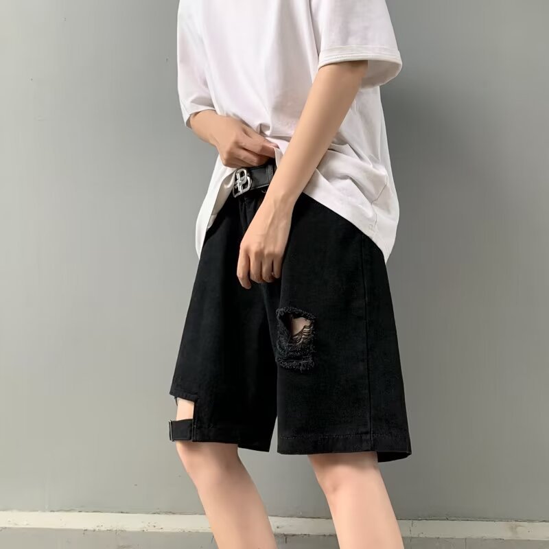 破洞牛仔短裤男夏季薄款宽松五分美式vibe裤子潮牌小众设计感中裤