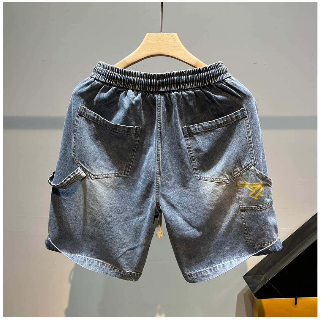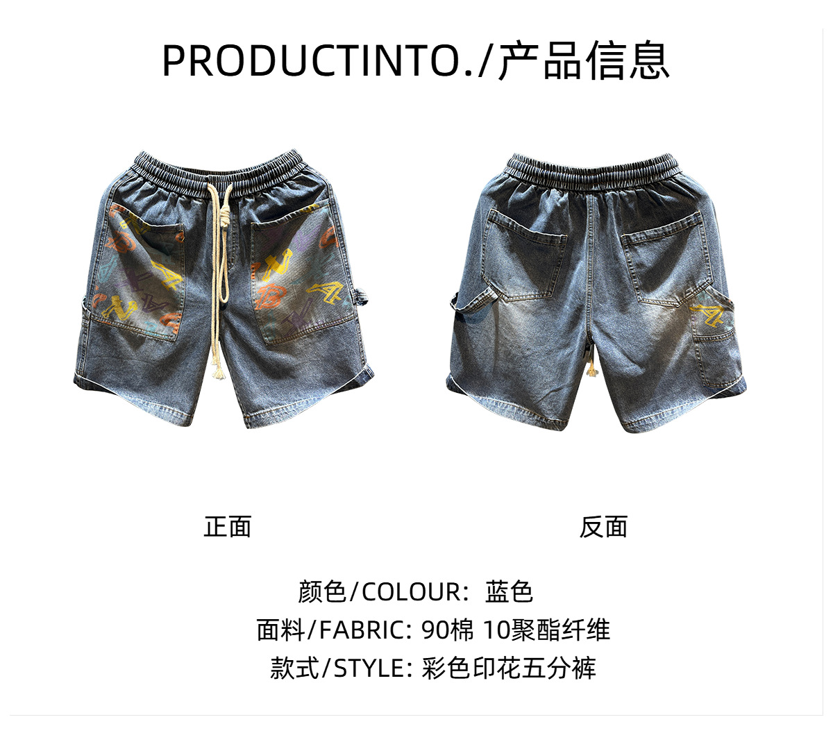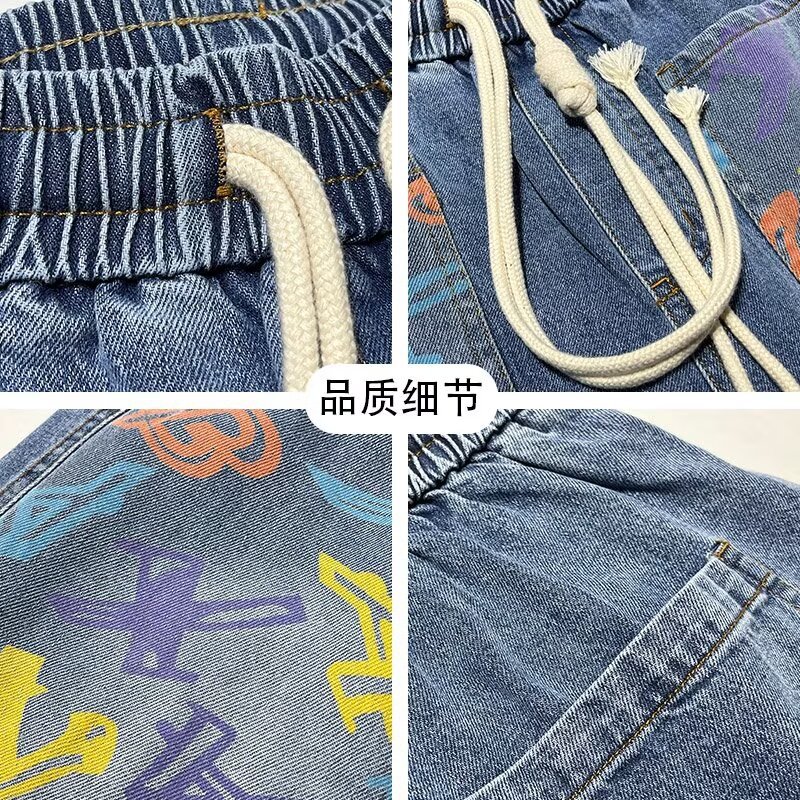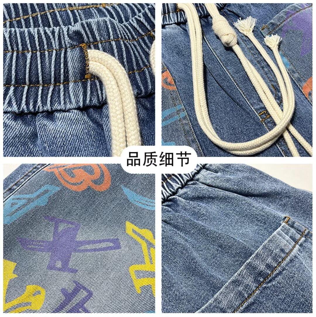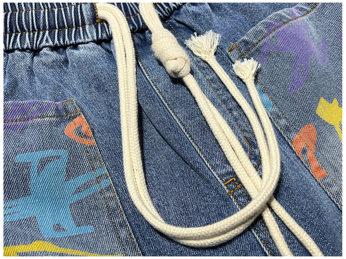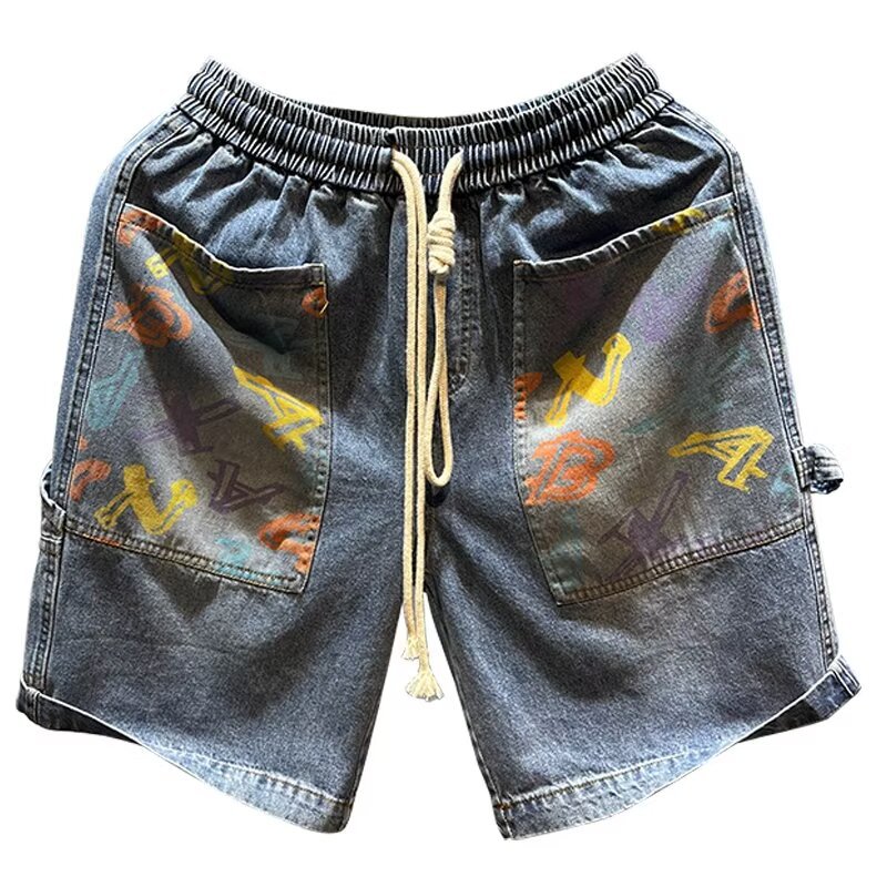 涂鸦牛仔短裤男夏季新款宽松潮牌马裤松紧腰美式高街五分裤