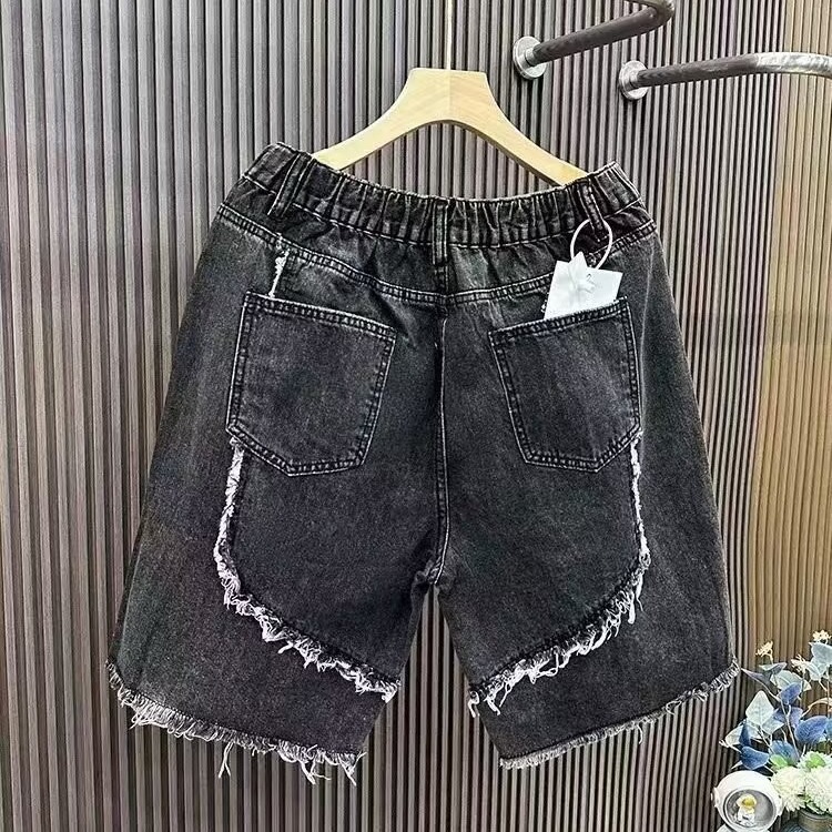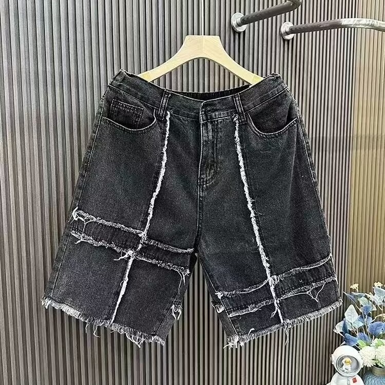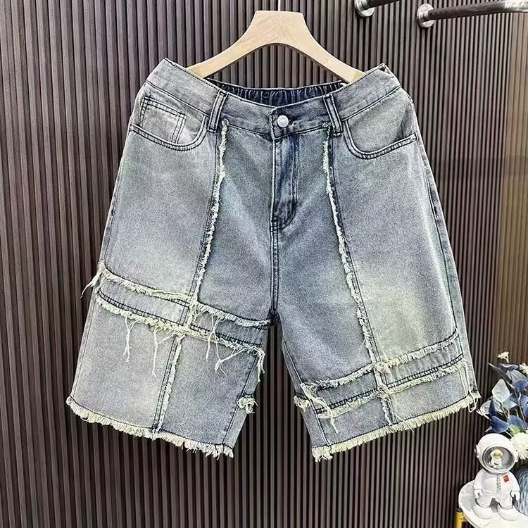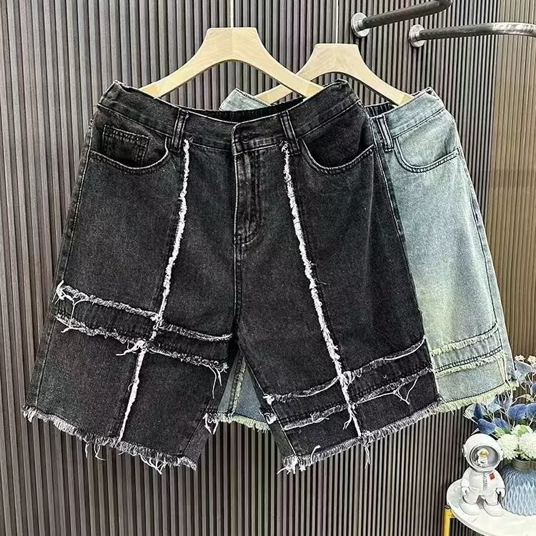 街头拼接休闲牛仔短裤男士高街潮流情侣夏季复古水洗毛边五分中裤