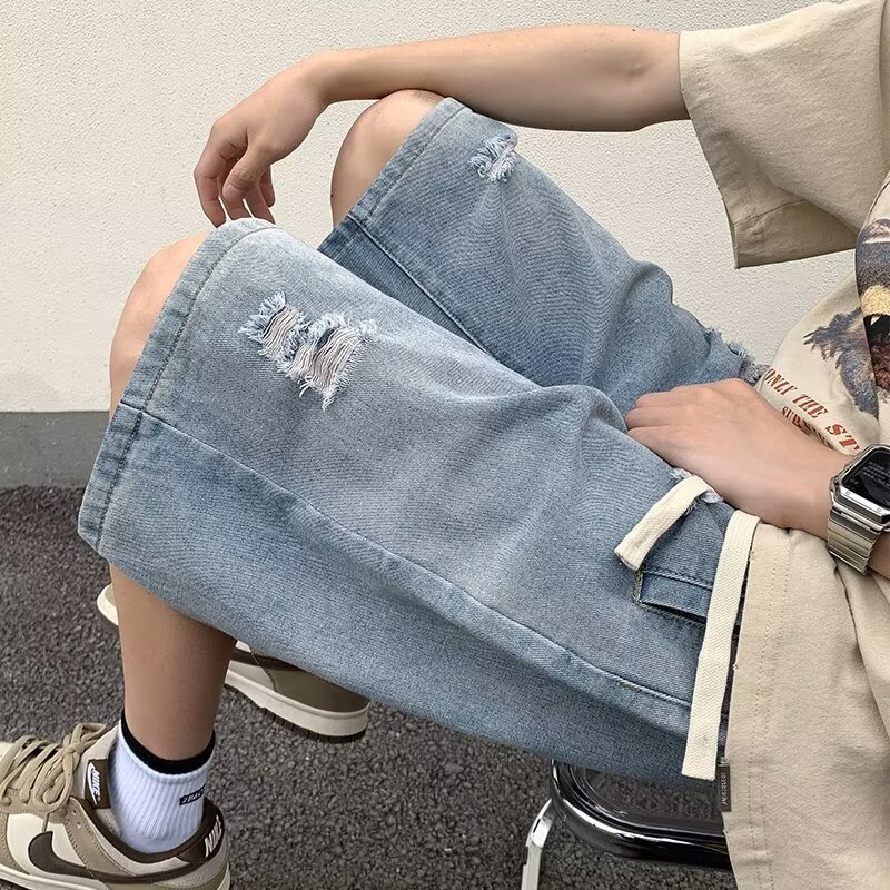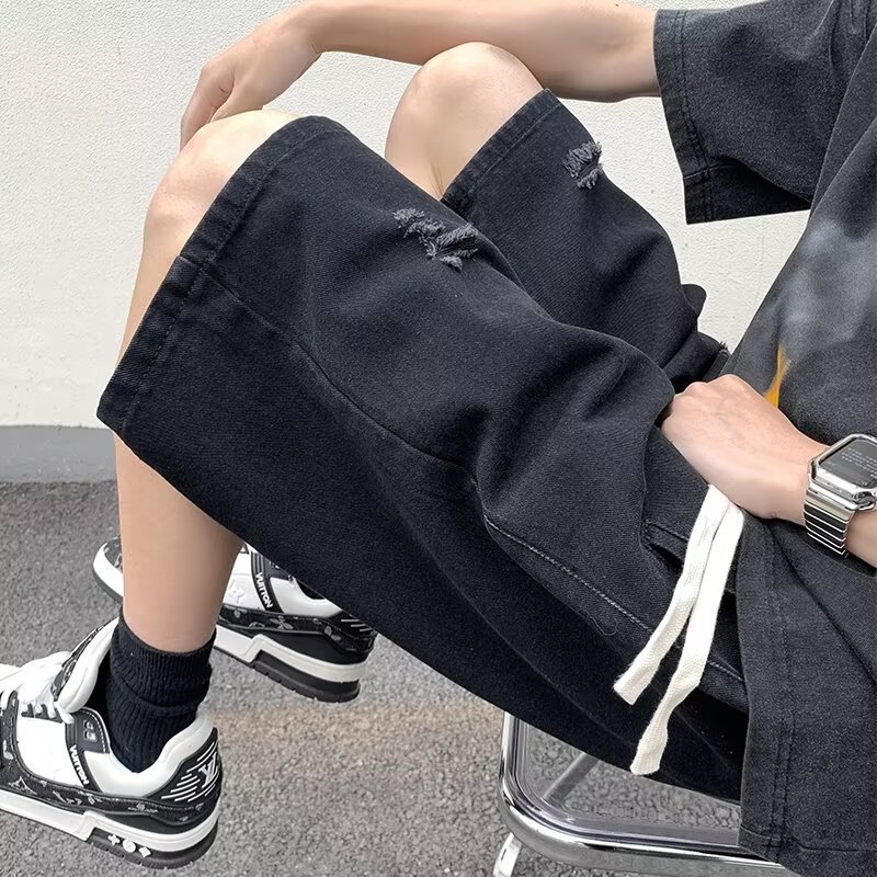 破洞牛仔短裤男士夏季薄款五分裤子美式潮牌高街宽松休闲夏天中裤