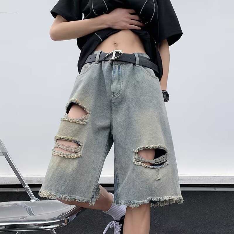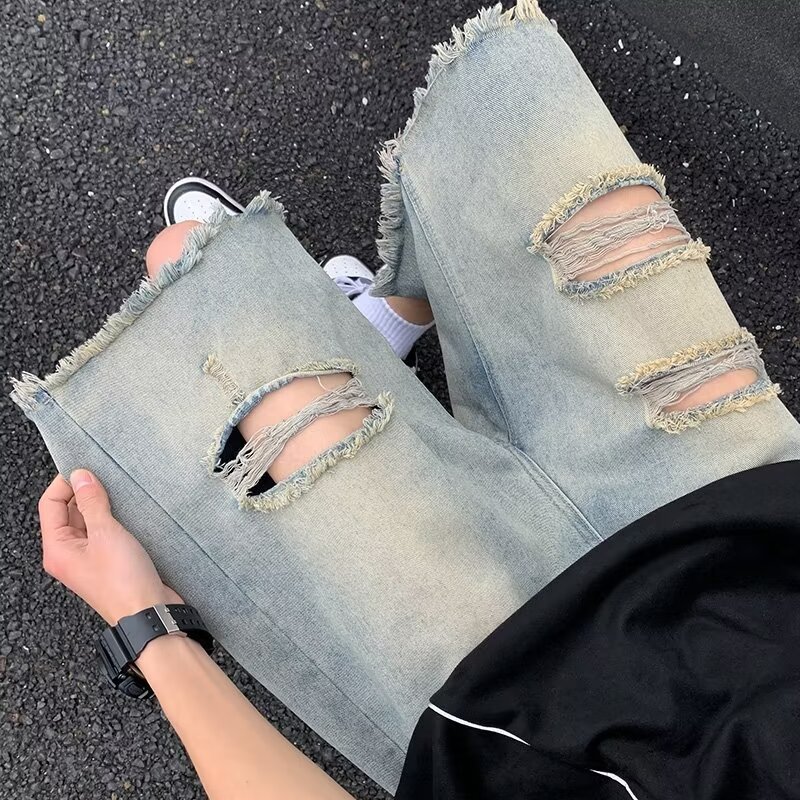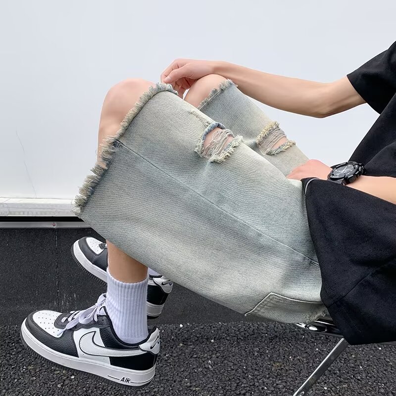 乞丐街头痞帅牛仔短裤男夏季潮牌薄款宽松直筒中裤美式破洞五分裤