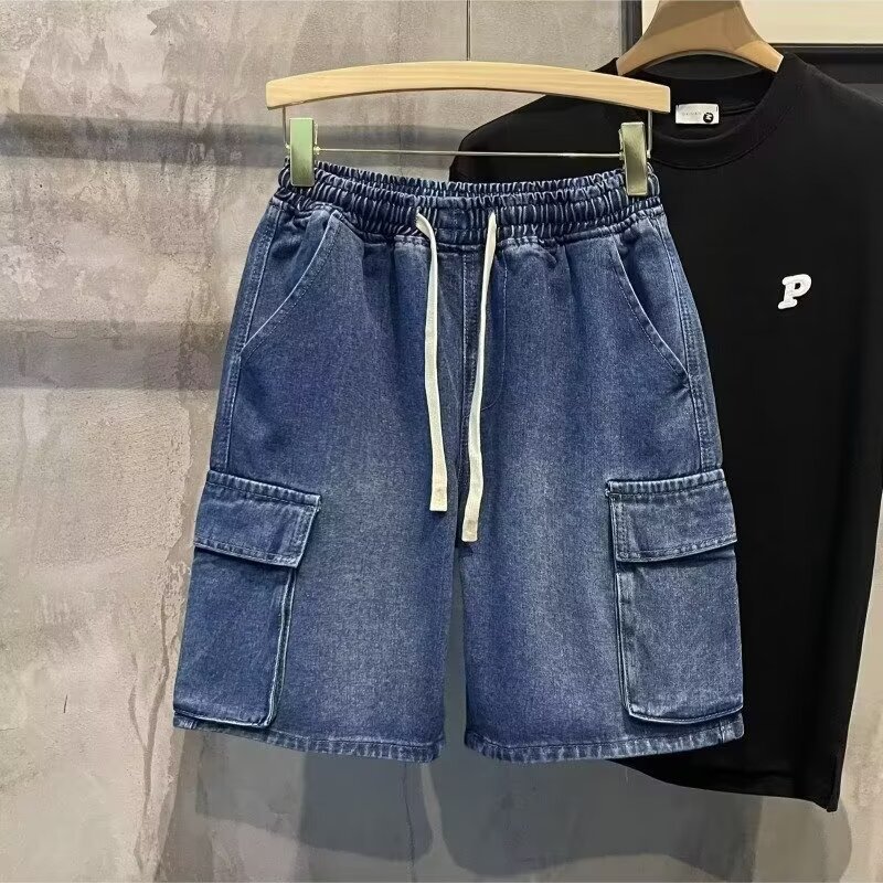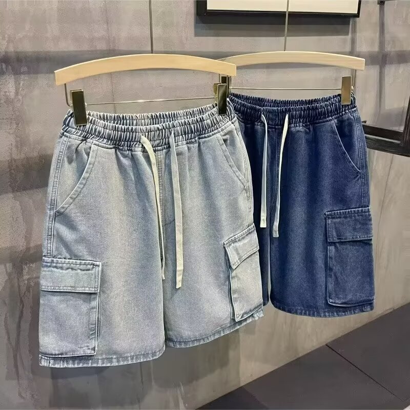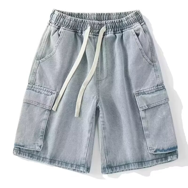 日系复古潮牌男士休闲工装牛仔短裤夏季多口袋松紧腰干活穿五分裤