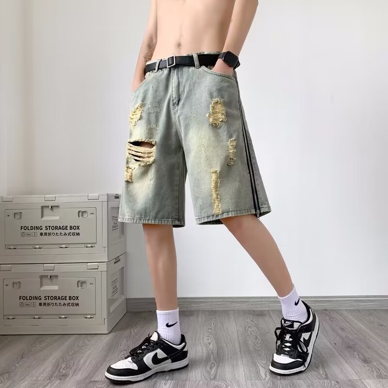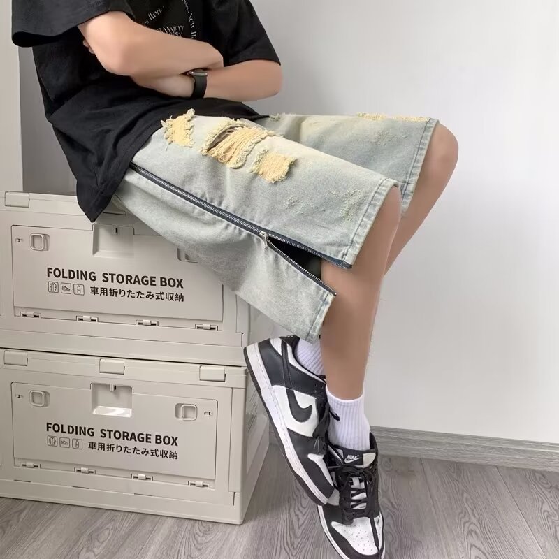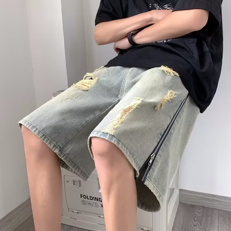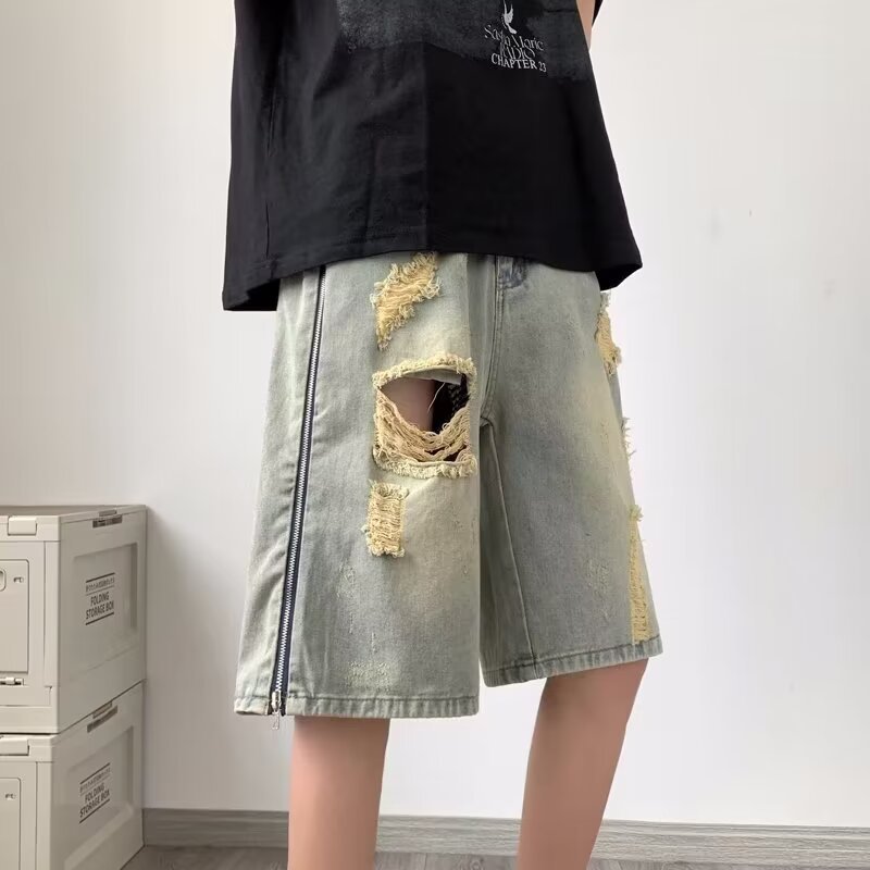 网红黄泥染破洞牛仔短裤男款侧拉链夏季高街复古运动休闲五分裤子