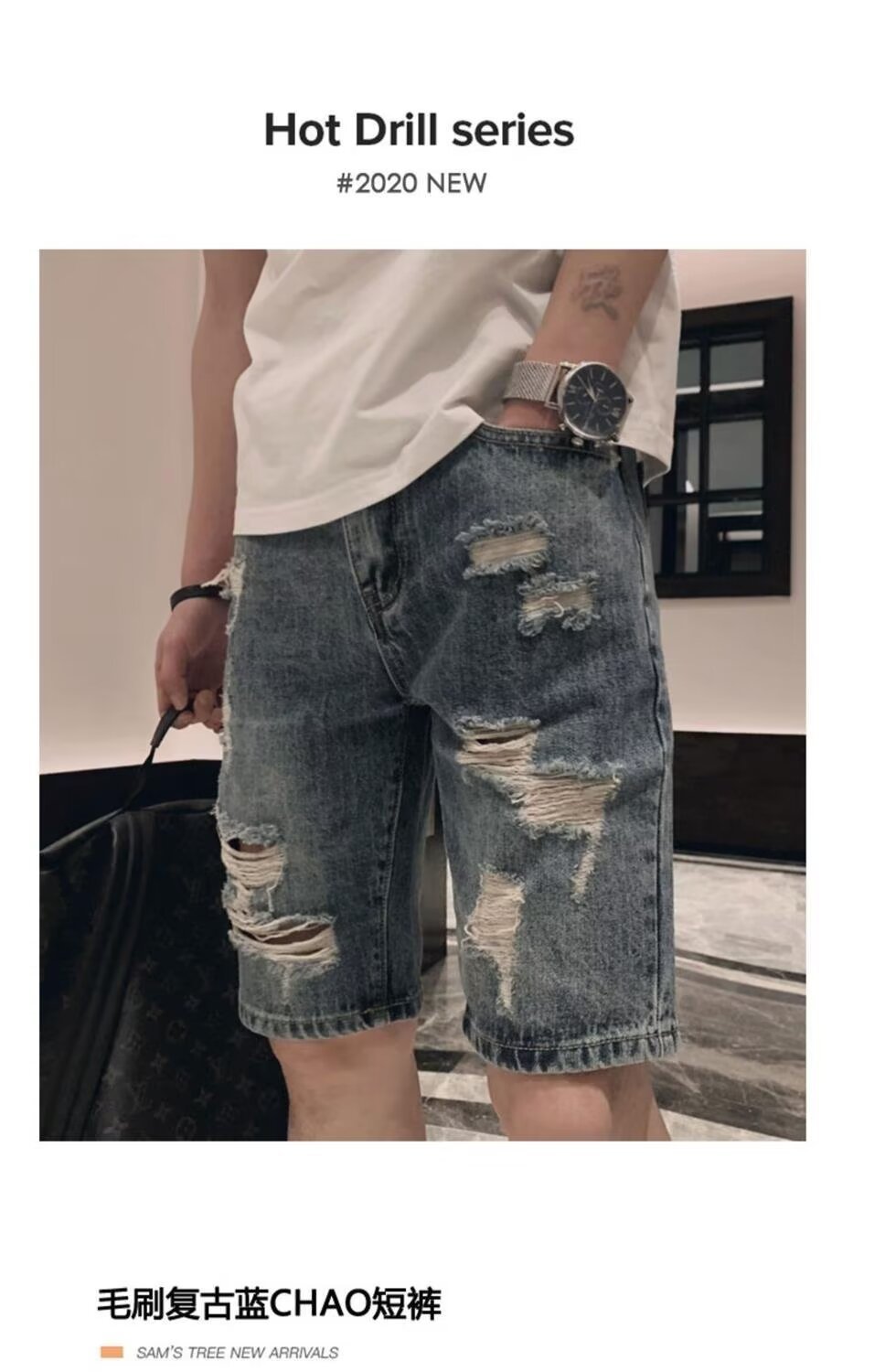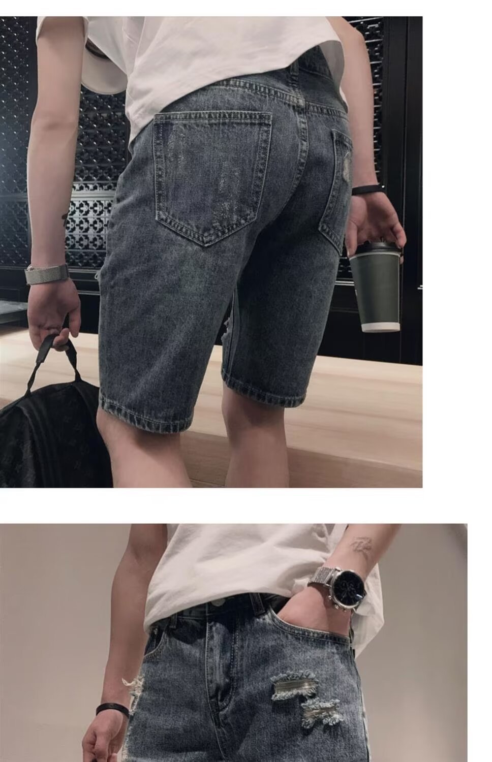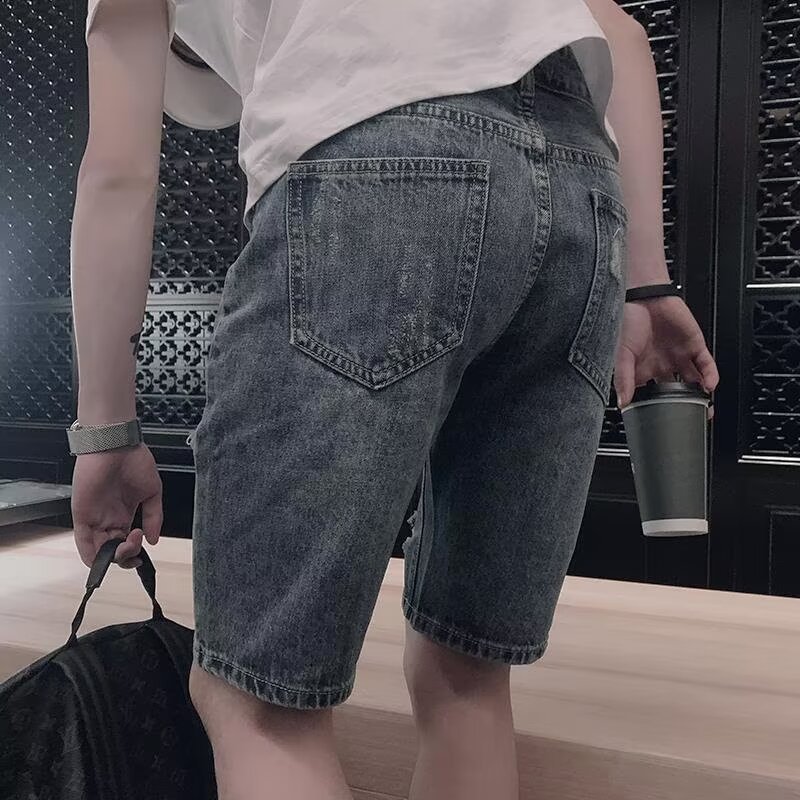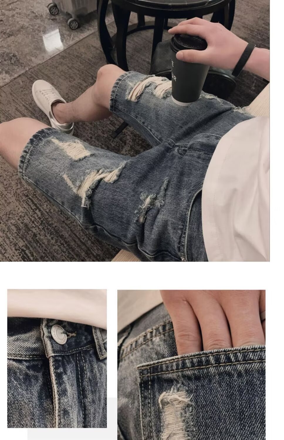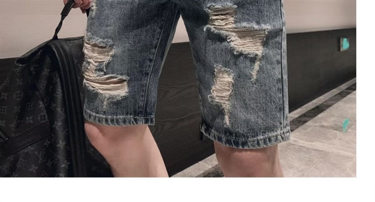 夏天破洞薄款中裤潮牌五分裤男士牛仔短裤直筒宽松韩版潮流