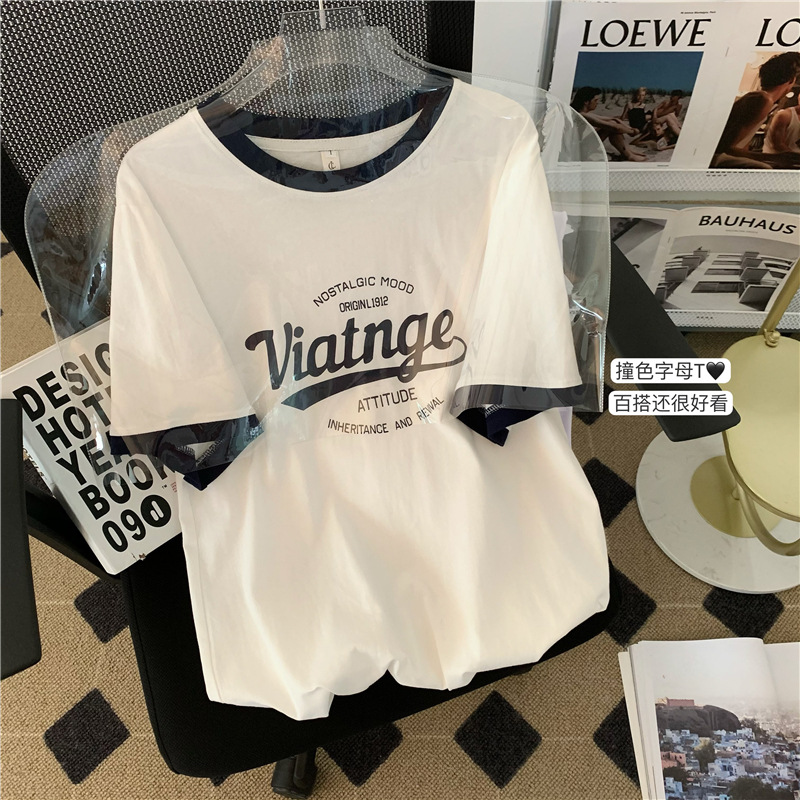 设计感不规则短袖T恤女夏季复古显瘦V领修身辣妹字母正肩短款上衣