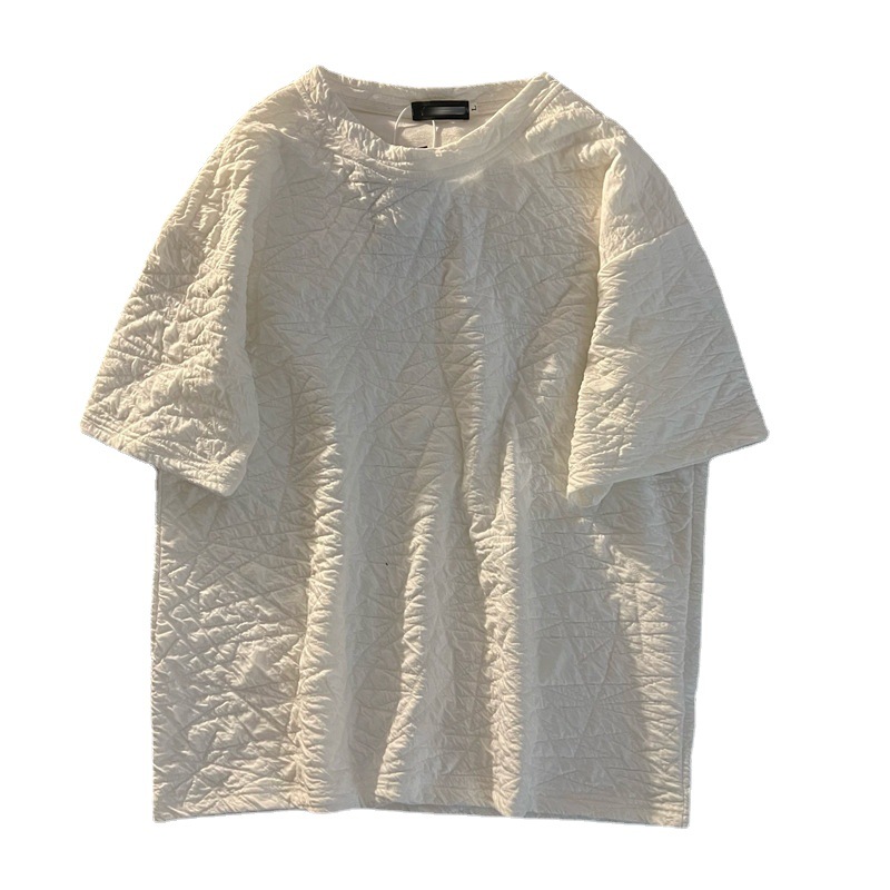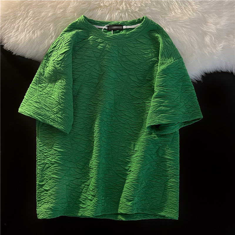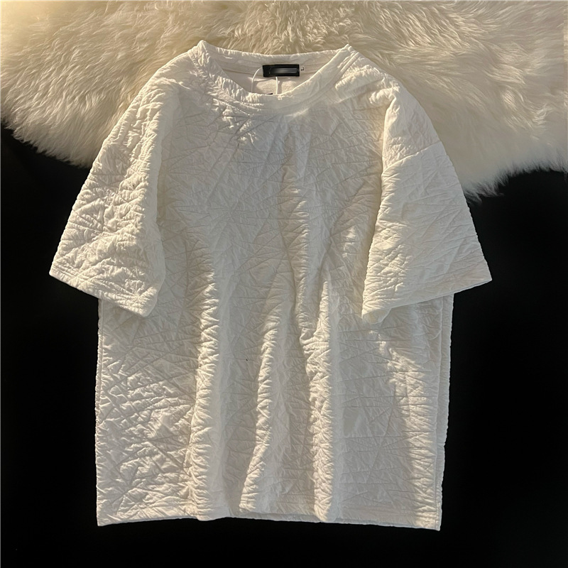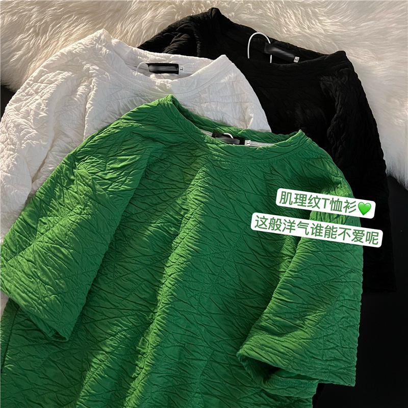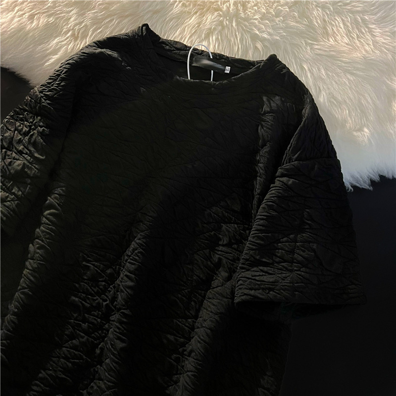欧美个性高级感肌理纹中长款短袖T恤夏季正肩五分袖情侣上衣