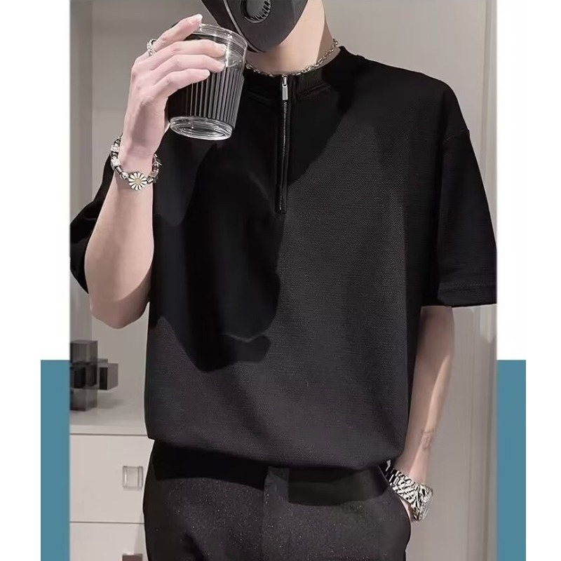 跨境宽松休闲半袖ins韩版潮流百搭拉链POLO衫短袖T恤男夏季翻领