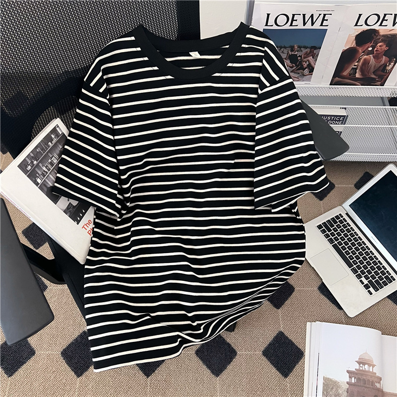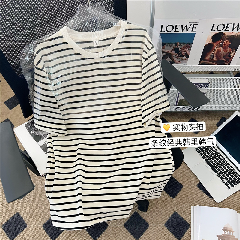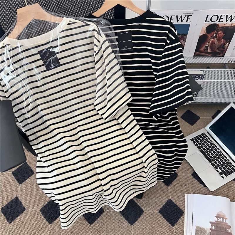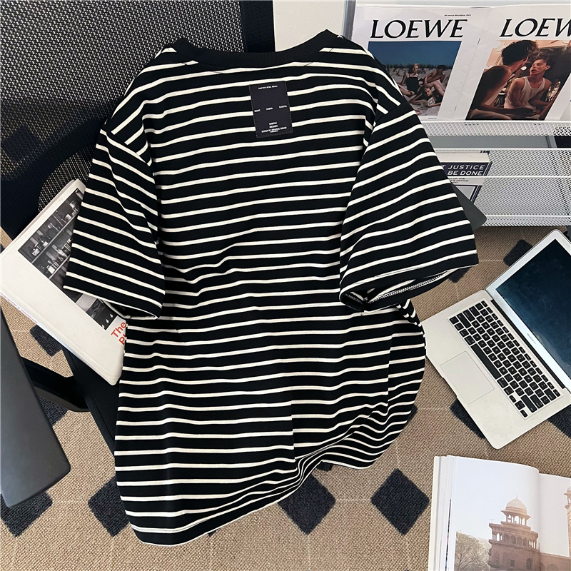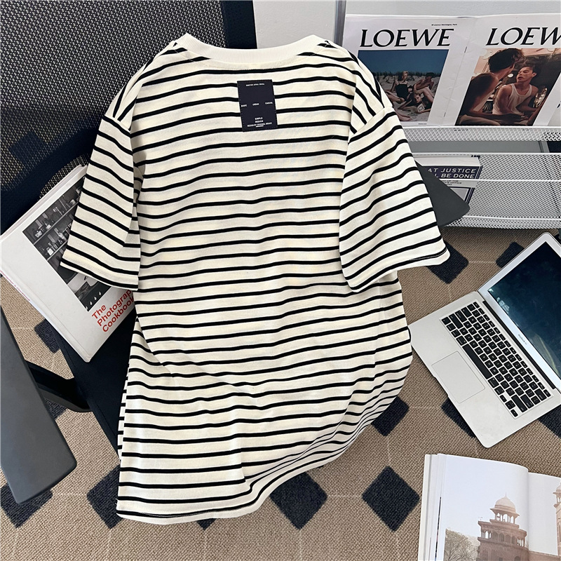 宽松慵懒风中长款条纹短袖T恤女夏韩版后背贴布正肩半袖上衣