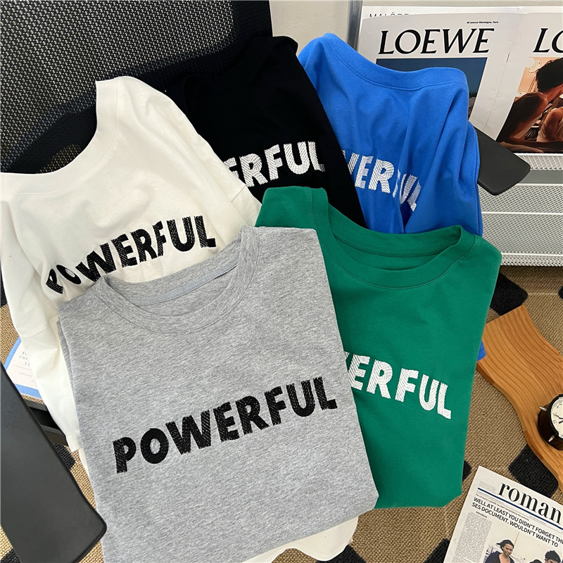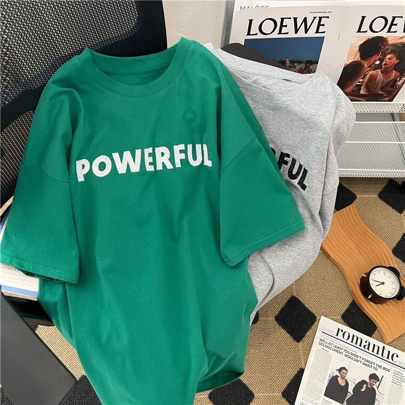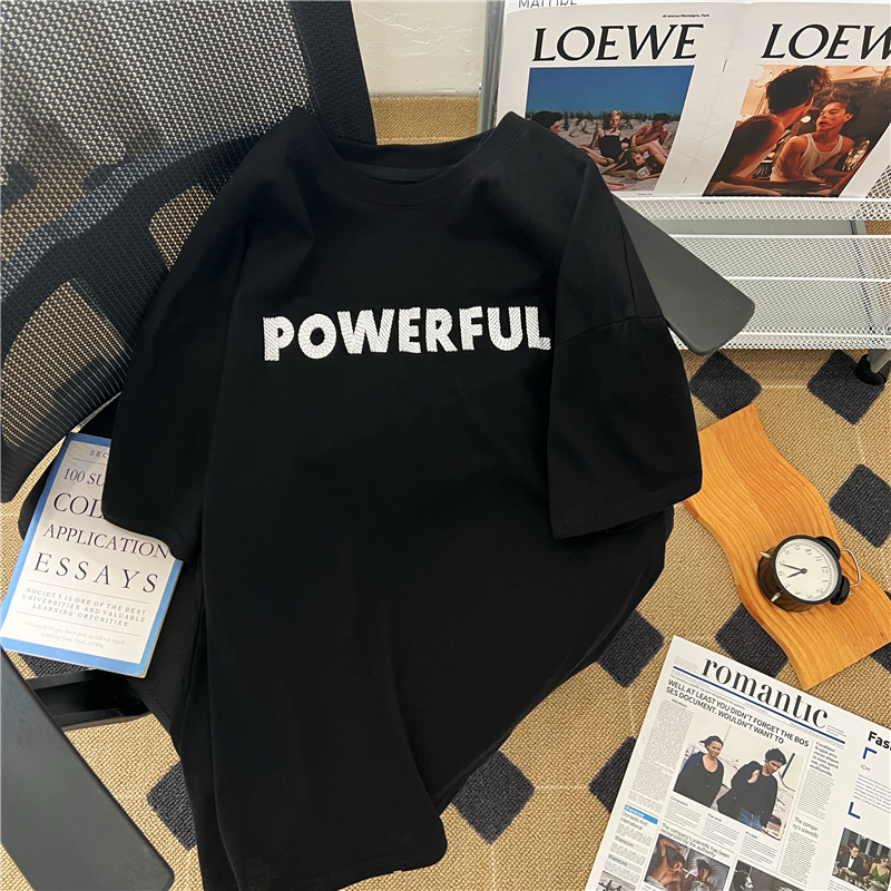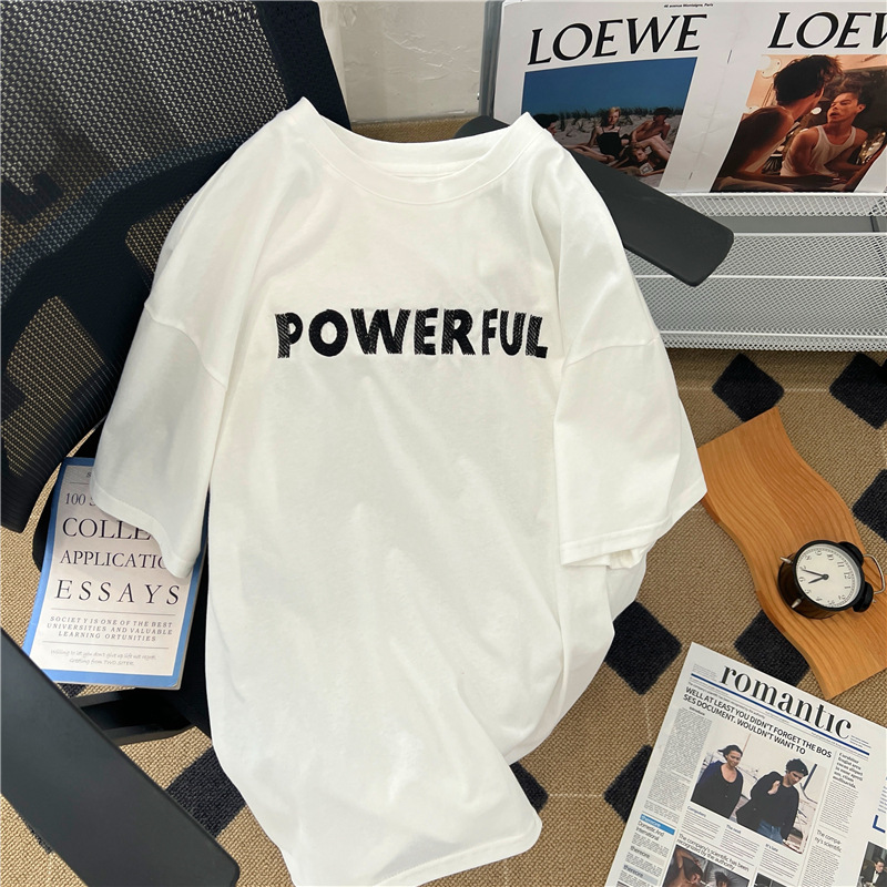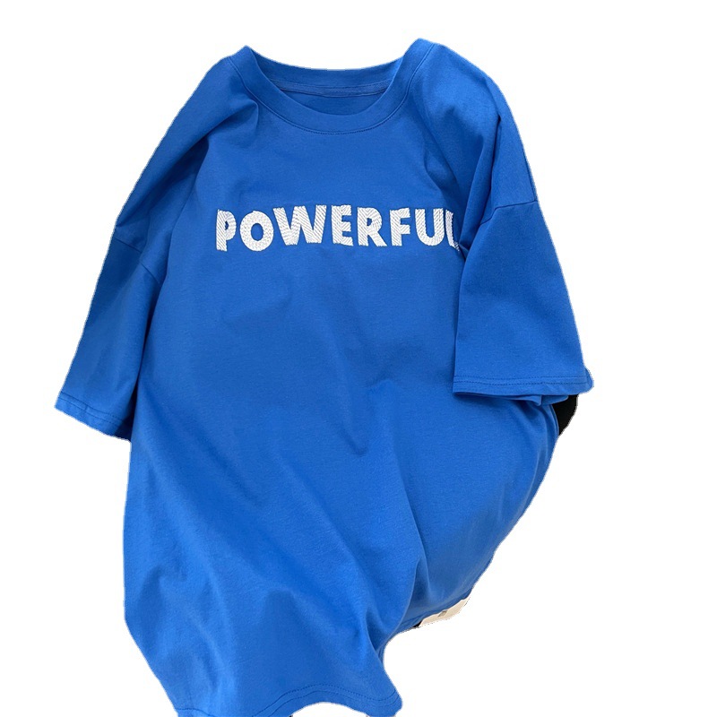 外贸批发美式复古绣花正肩宽松中长款纯棉短袖T恤网红五分袖上衣