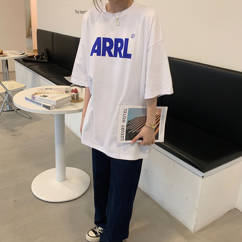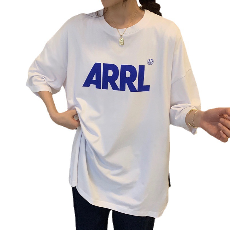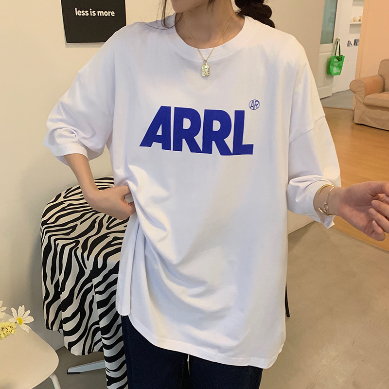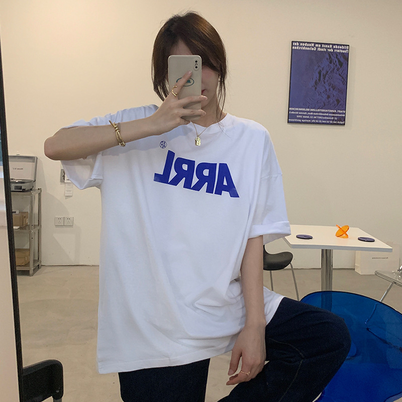 简约字母印花纯棉T恤女夏季新款宽松百搭短袖小众中长款上衣