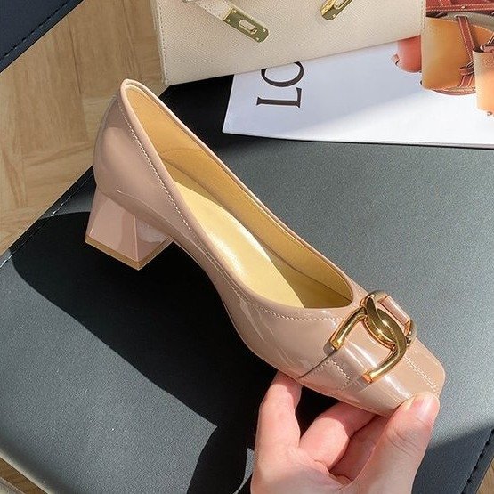 女鞋法式方头单鞋女软皮秋季新款通勤气质粗跟方扣高跟鞋