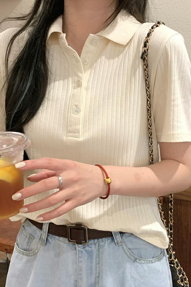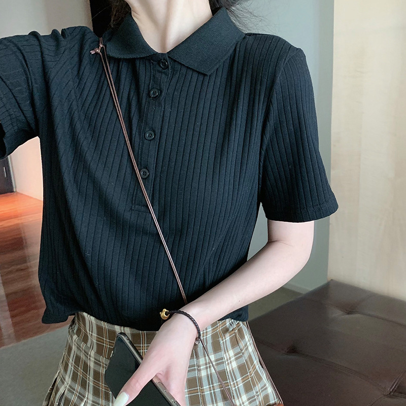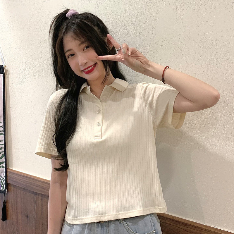 韩版正肩别致短款上衣新款纯色坑条短袖T恤女夏季辣妹POLO衫