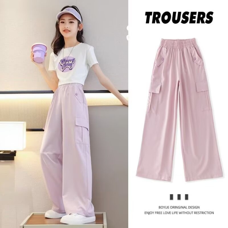 夏季女童阔腿裤儿童裤子冰丝工装裤新款防蚊裤女大童夏装长裤