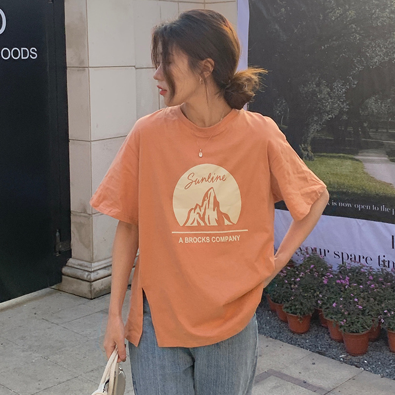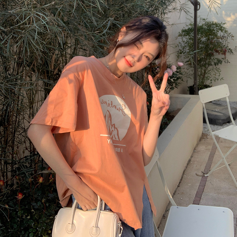 侧边分叉小众别致短袖T恤女夏季圆领正肩上衣宽松显瘦春秋打底衫
