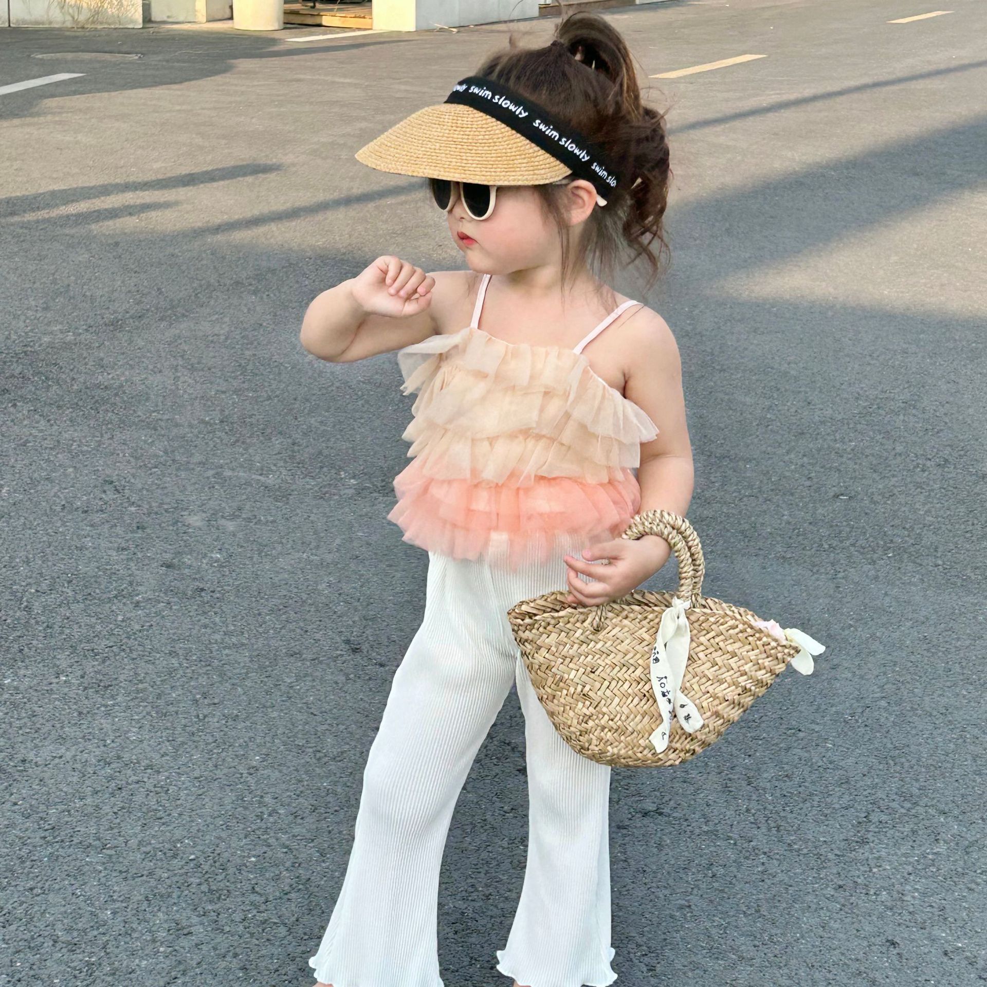 夏季新款童装女童网纱层层蛋糕吊带背心+修身弹力喇叭裤两件