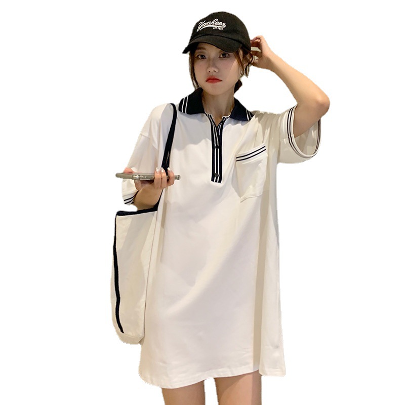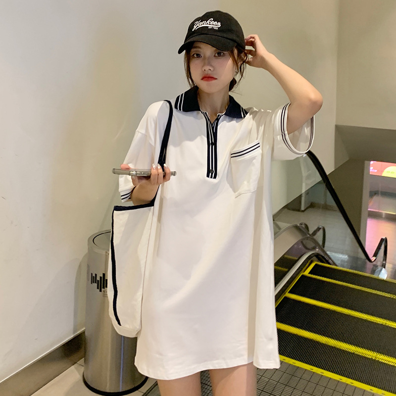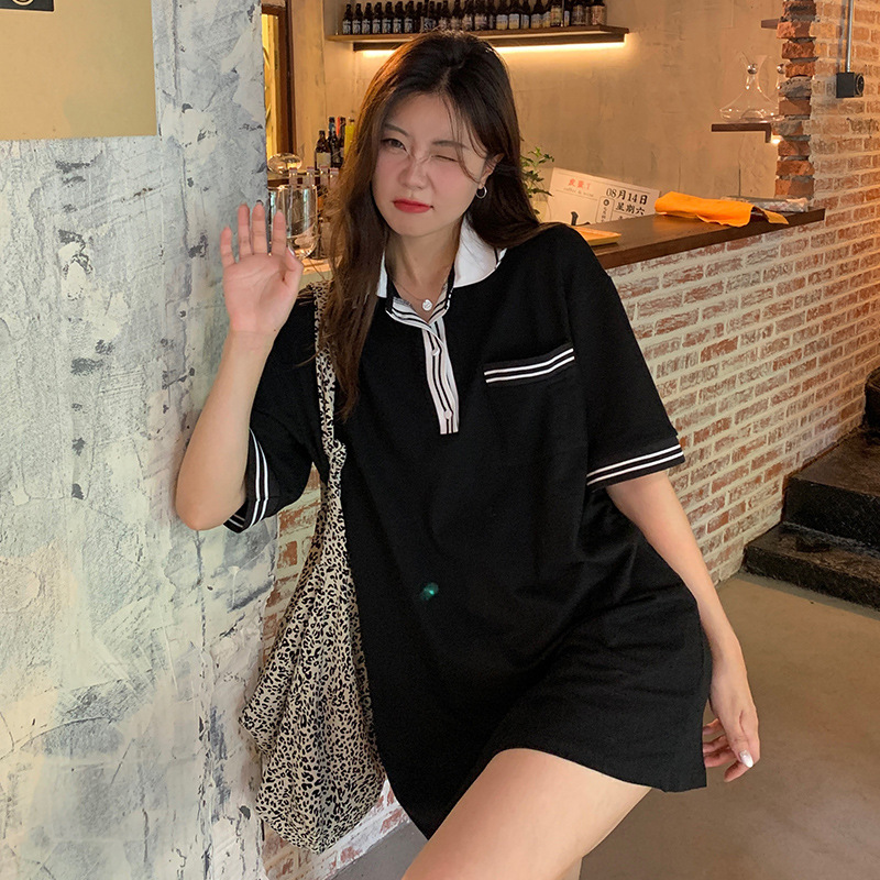 夏季POLO领纯棉过臀短袖T恤裙胖MM大码女装短裙设计感撞色连衣裙