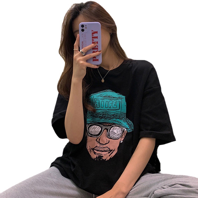 美式复古做旧创意印花短袖T恤夏季宽松显瘦别致上衣欧美大码女装