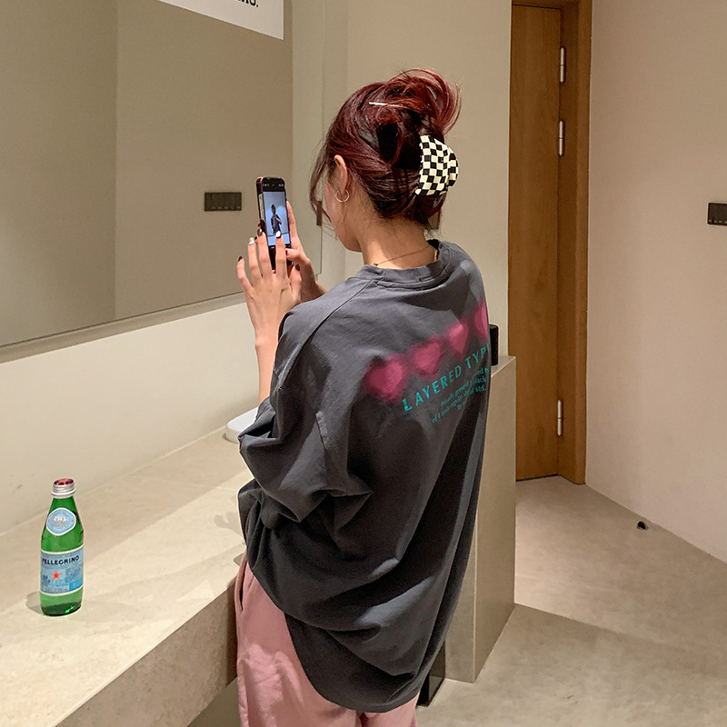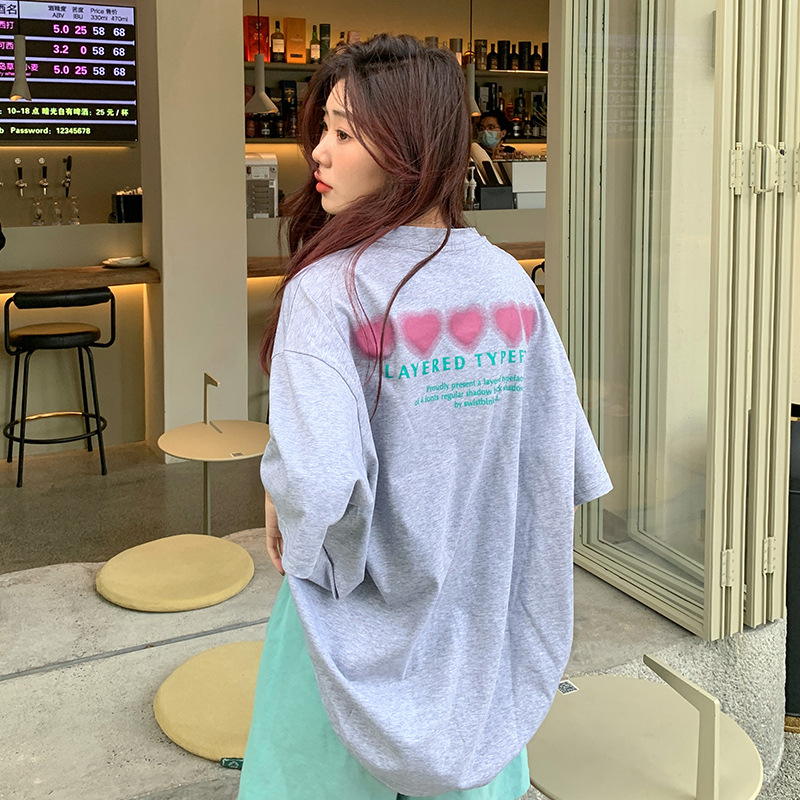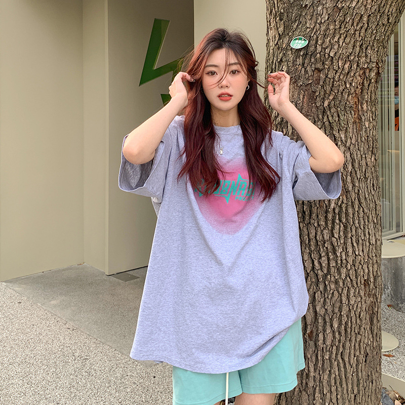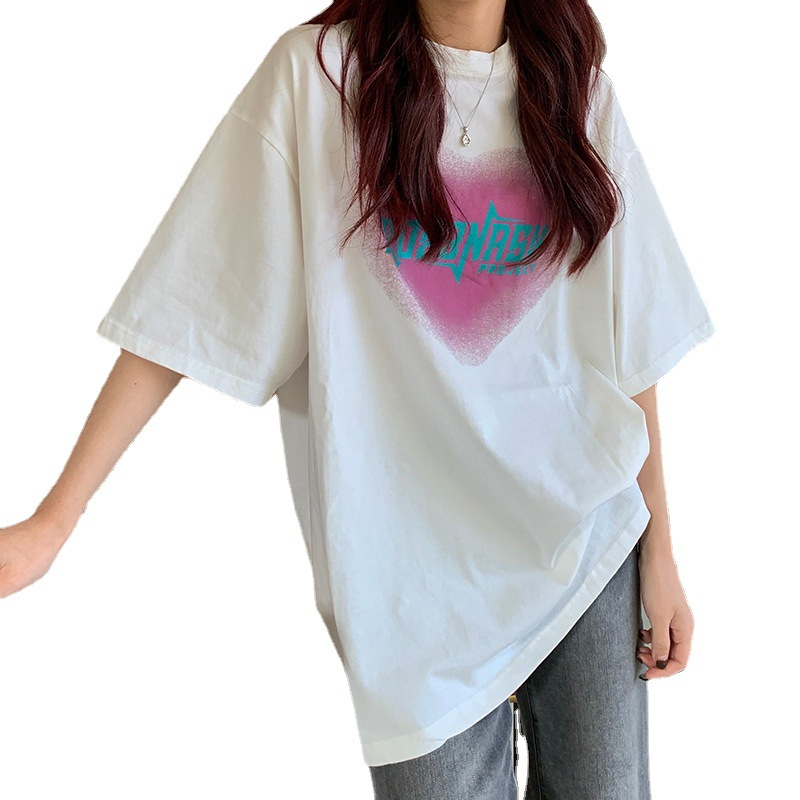 纯棉圆领正肩短袖T恤女欧美宽松大码女装夏季爱心印花中长款上衣