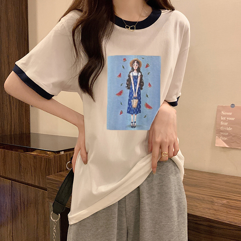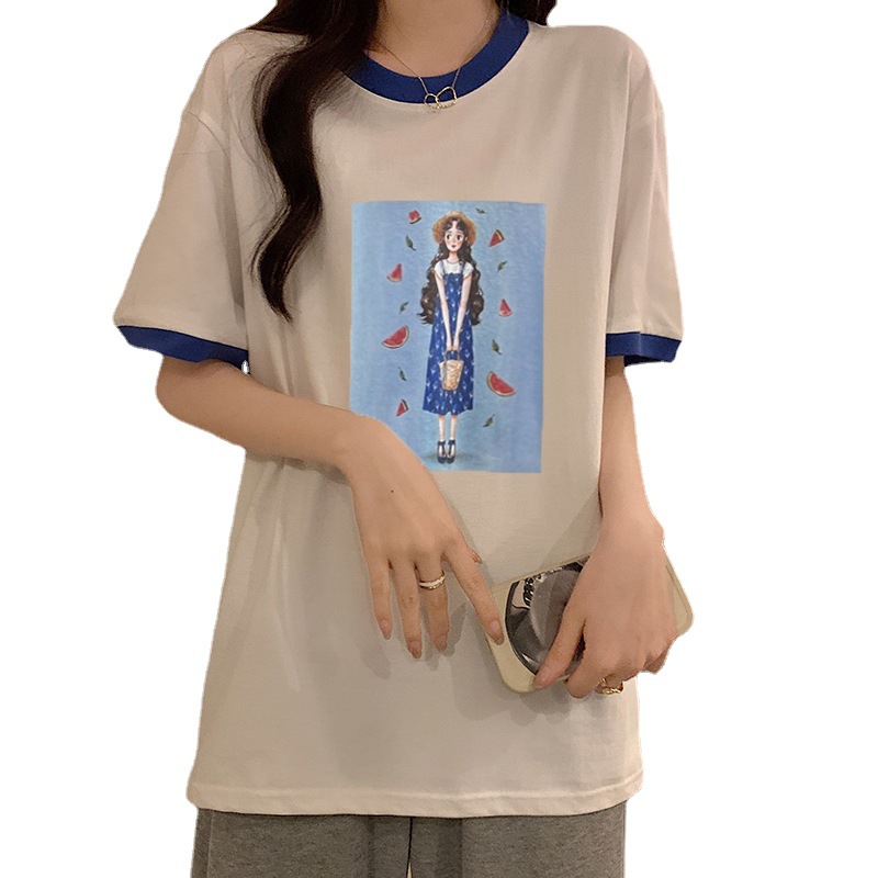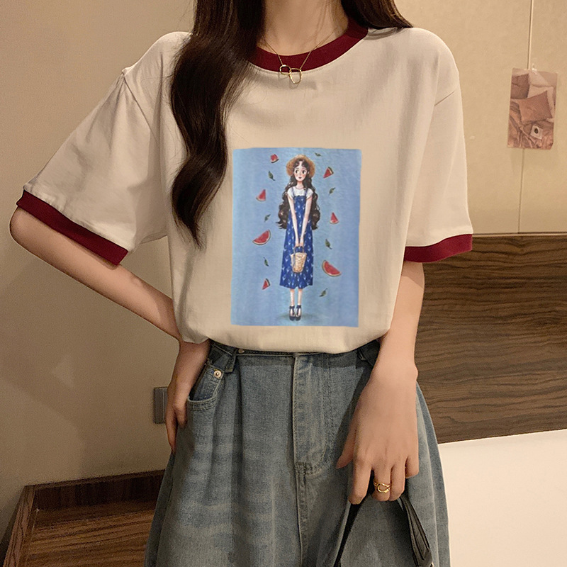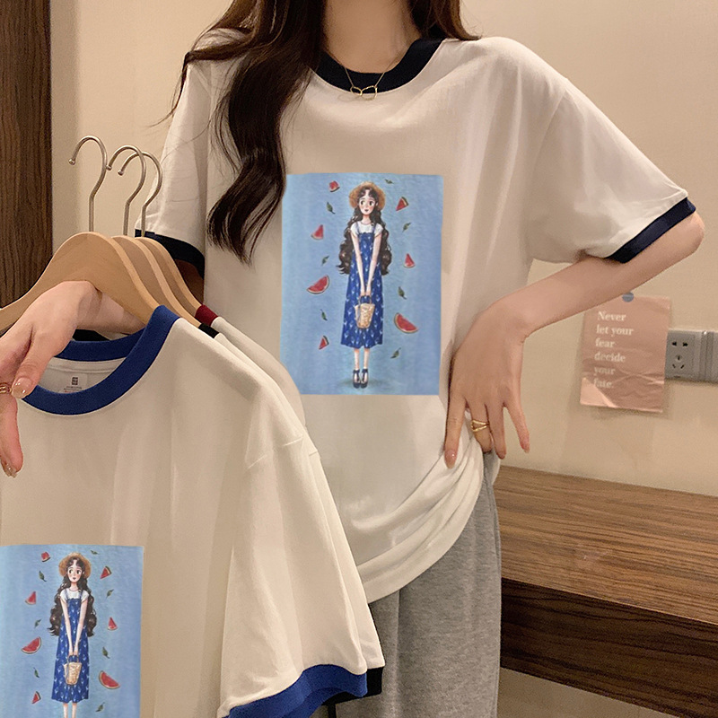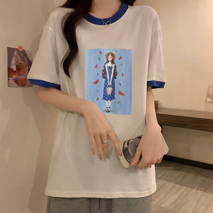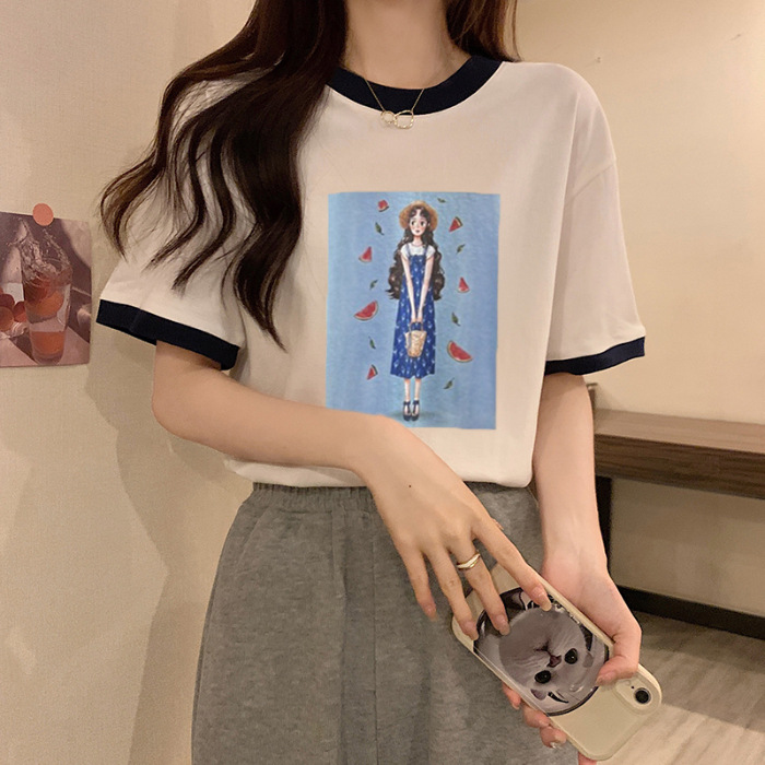 200克纯棉圆领短袖T恤夏季新款甜美女孩印花假两件撞色宽松上衣女