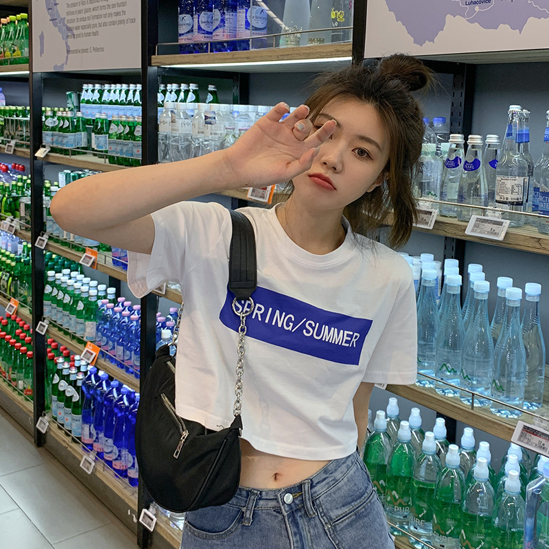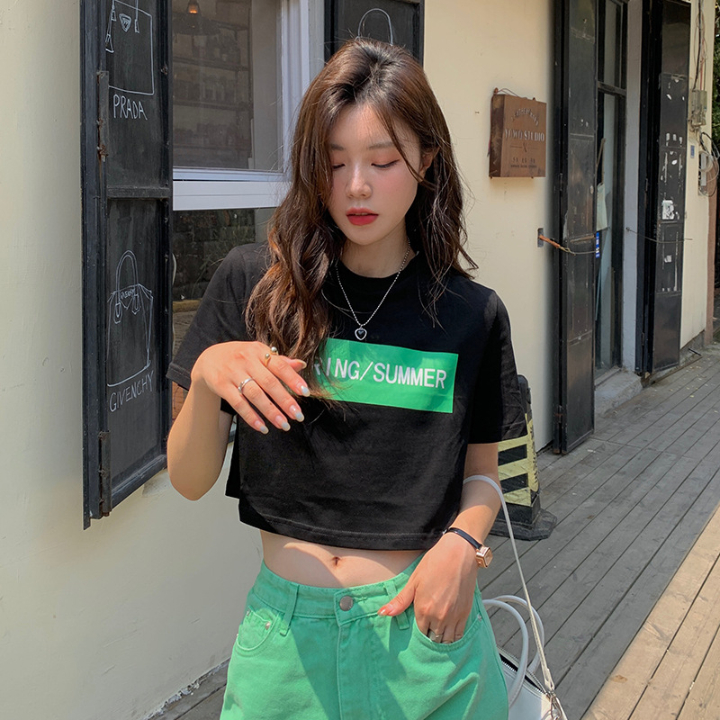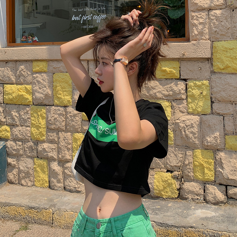 小众设计感撞色字母印花宽松短款上衣夏季新款遮肉显瘦短袖T