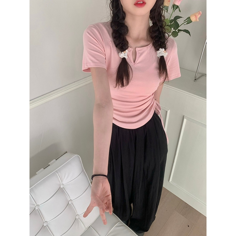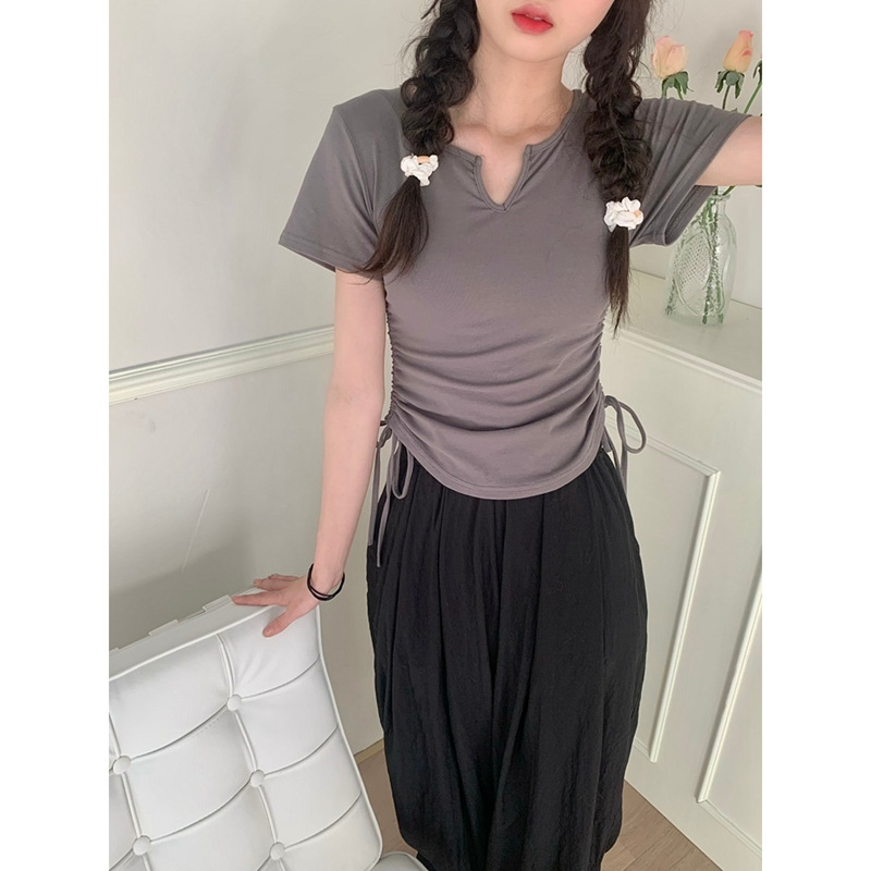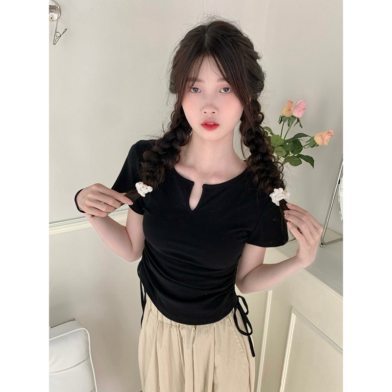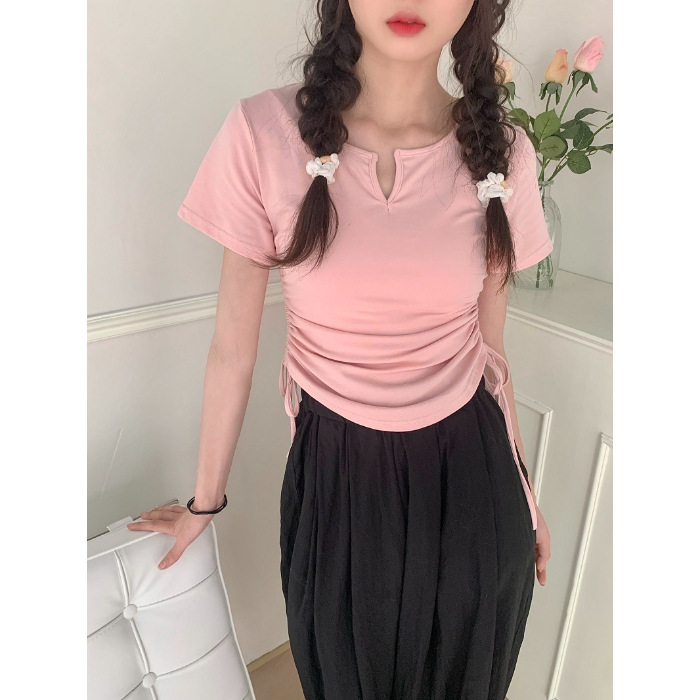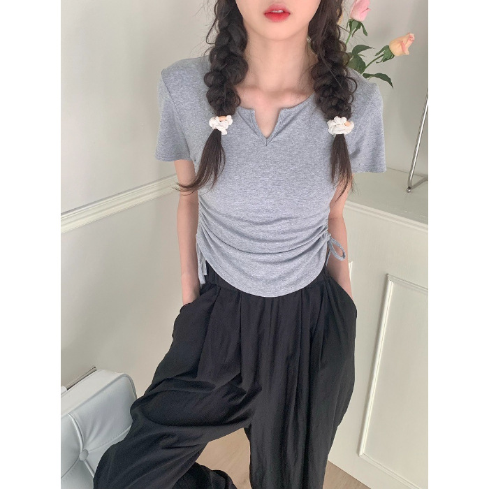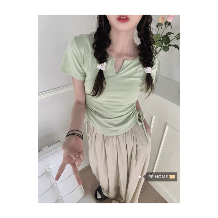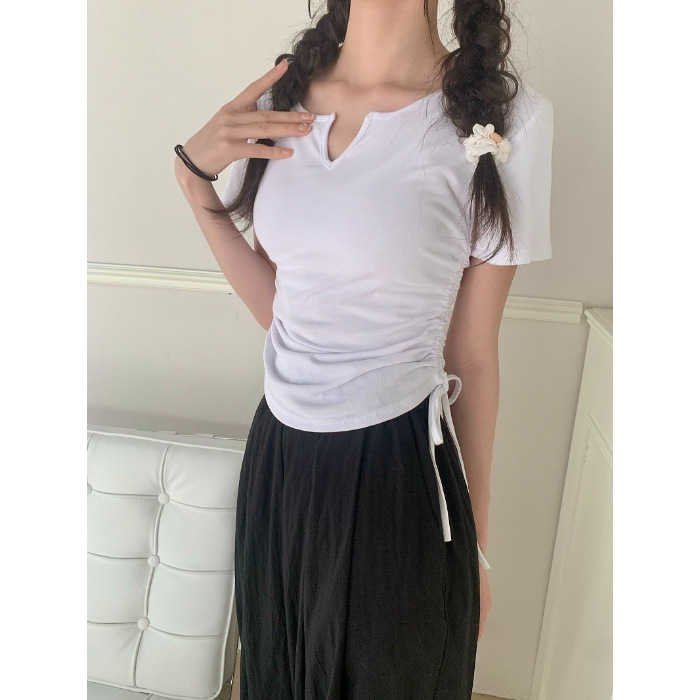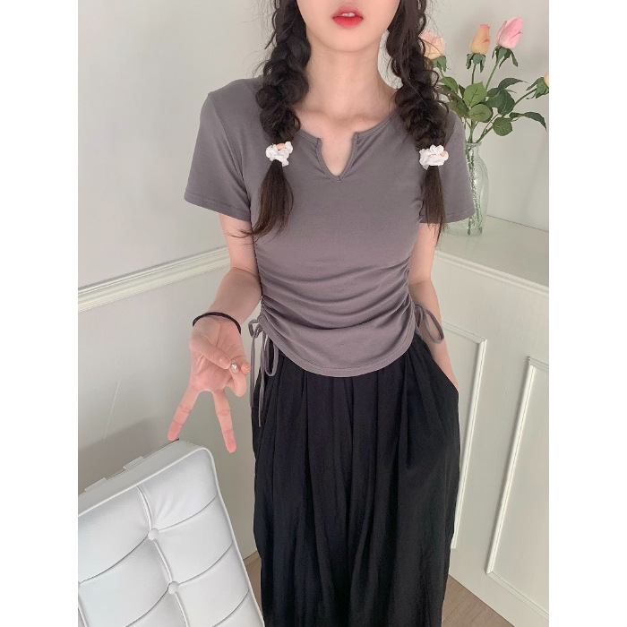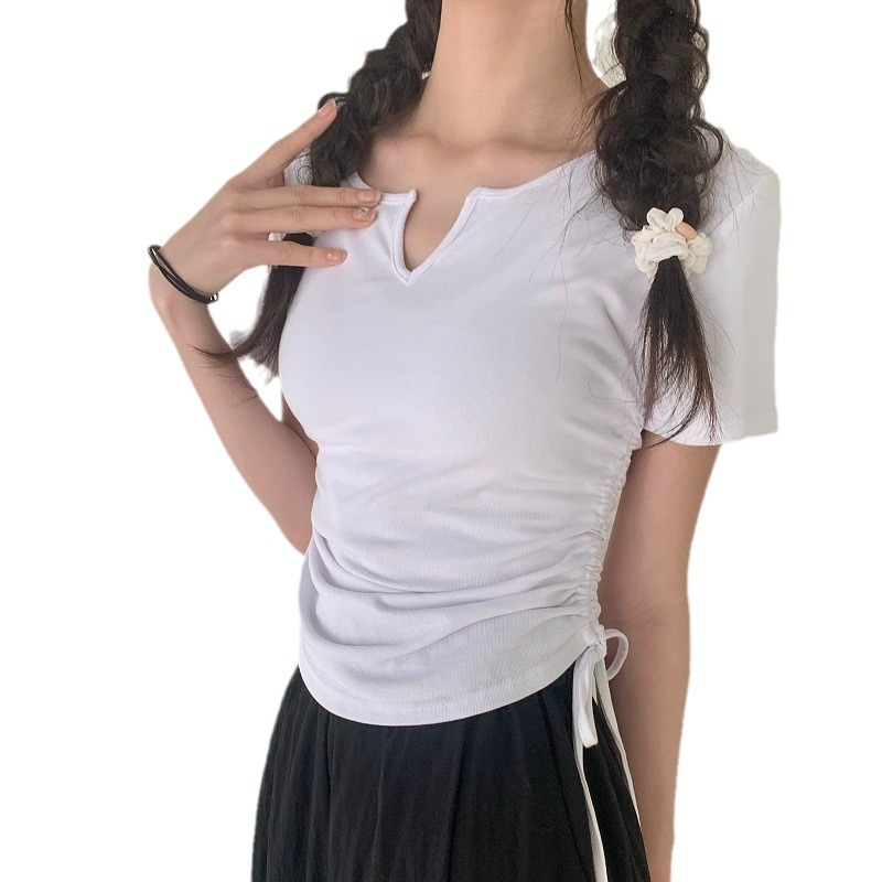 小个子V领短袖T恤女夏季新款修身显瘦设计感小众辣妹正肩上衣