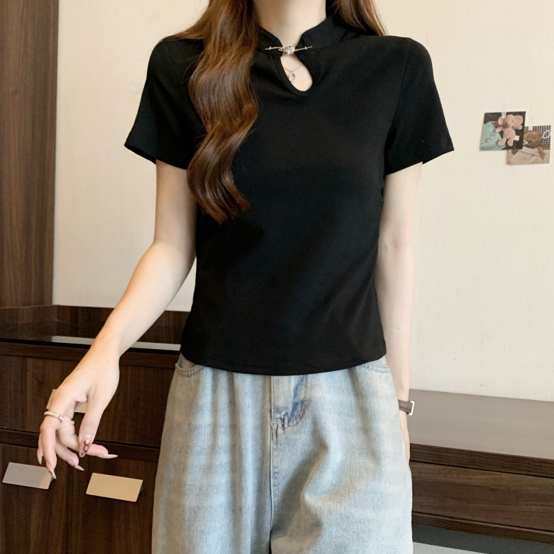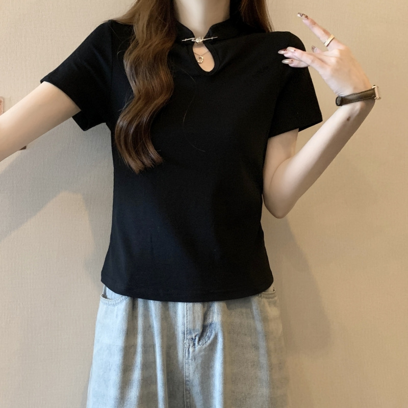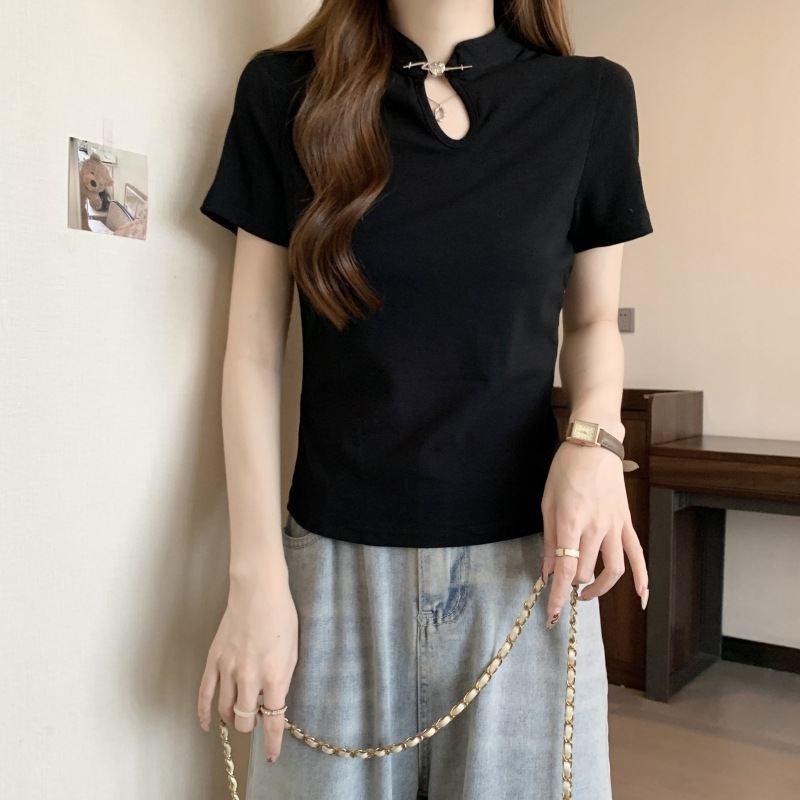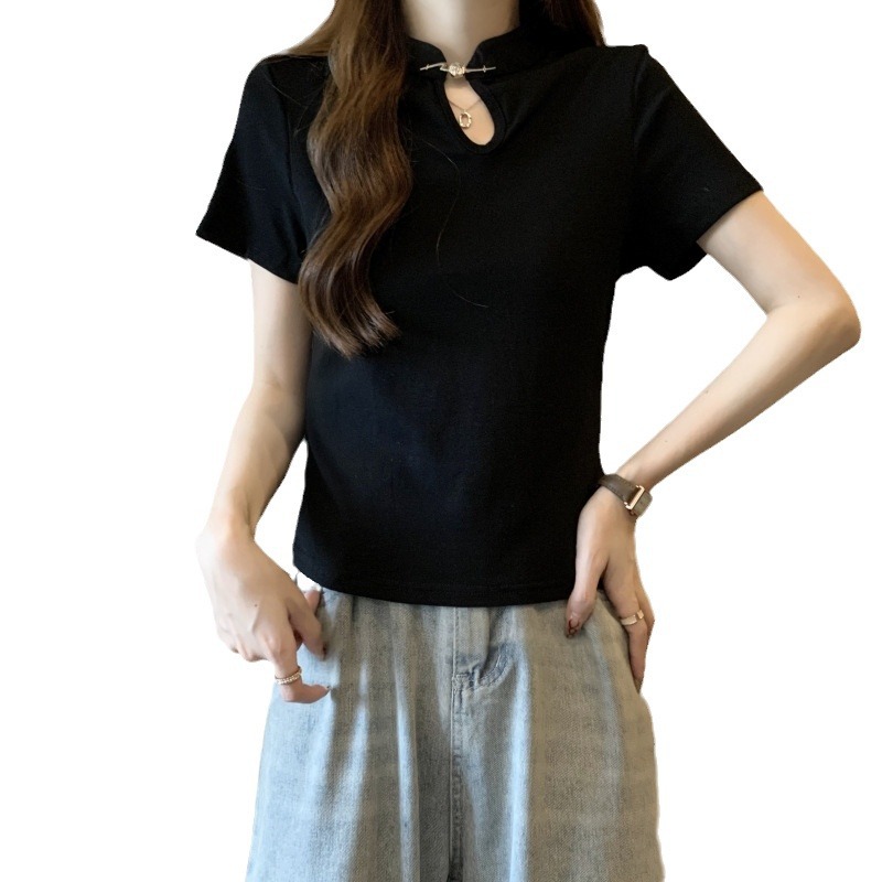 新中式镂空柳钉半开领短袖上衣夏季时尚流行简约百搭休闲纯色T恤