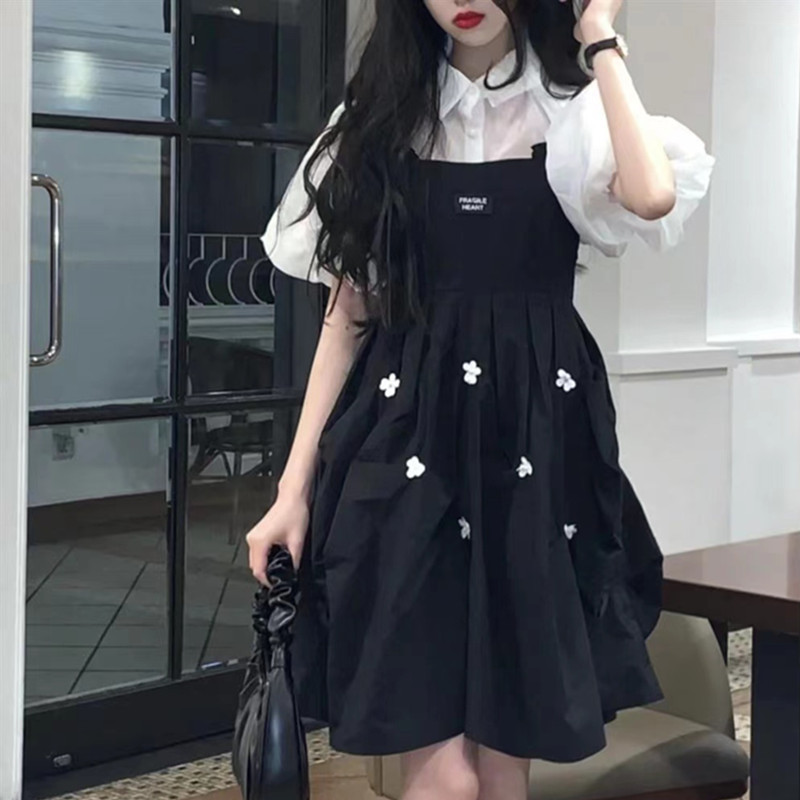 茶歇法式黑色吊带连衣裙女夏季设计感小花背带裙学院赫本风小黑裙